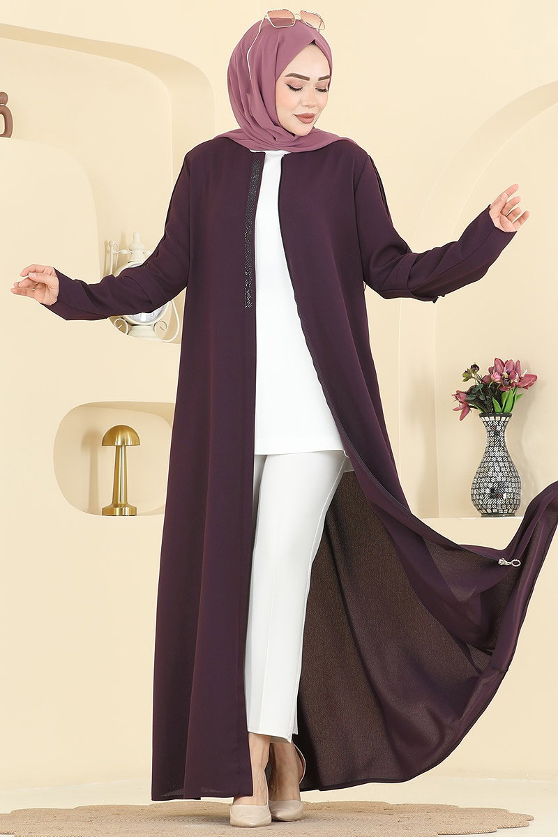 Elegant and modern, the Stone Detailed Stylish Ferace is suitable for all seasons. Made with honeycomb weave fabric, it is lightweight and breathable. It can be washed at 30 degrees on a gentle cycle. With its bike neck and front zipper, it offers practical use. The example on the model shows a size 42 for an appropriate fit. Stone print details and shoulder pads enhance the elegance of the ferace, while a hidden pocket adds practical functionality.