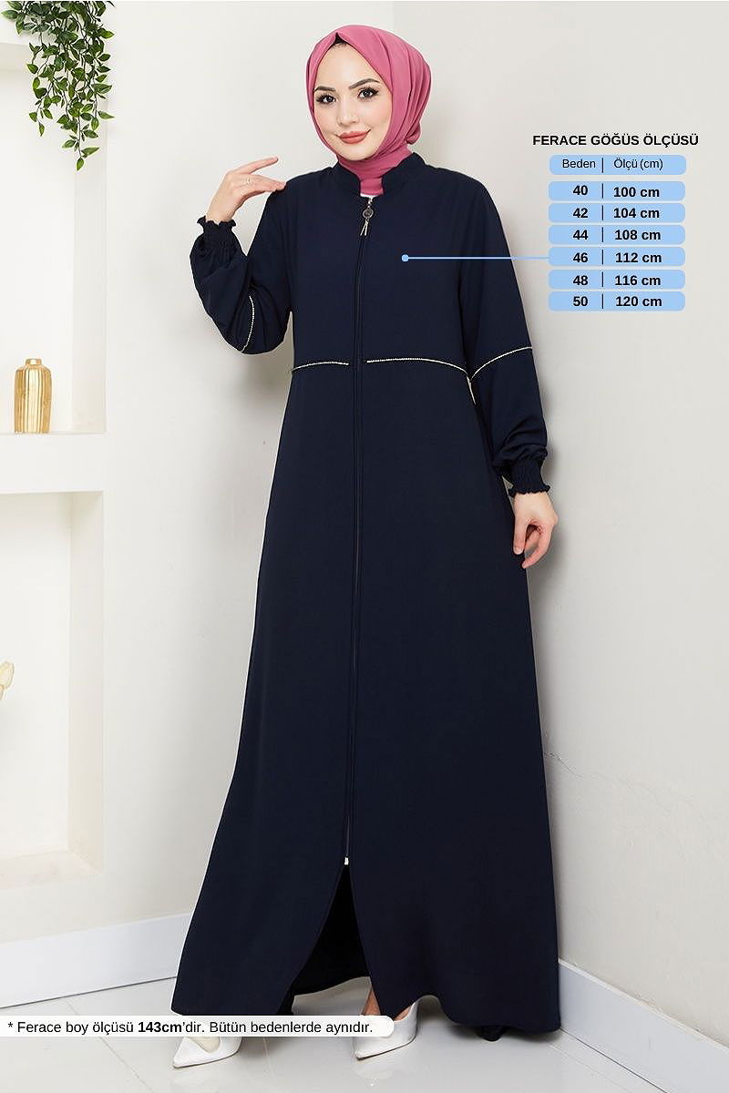Elegant and chic, the Stone Detailed Ferace is a modest wear suitable for all seasons. Made from delicate crepe fabric, this ferace can be washed at 30 degrees on a gentle cycle. It features a semi-mandarin collar, front zipper, and elasticated cuffs, offering a modern look. The stone embellishments add a sophisticated sparkle. The product is unlined and includes practical side pockets. The model displayed is wearing size 40.