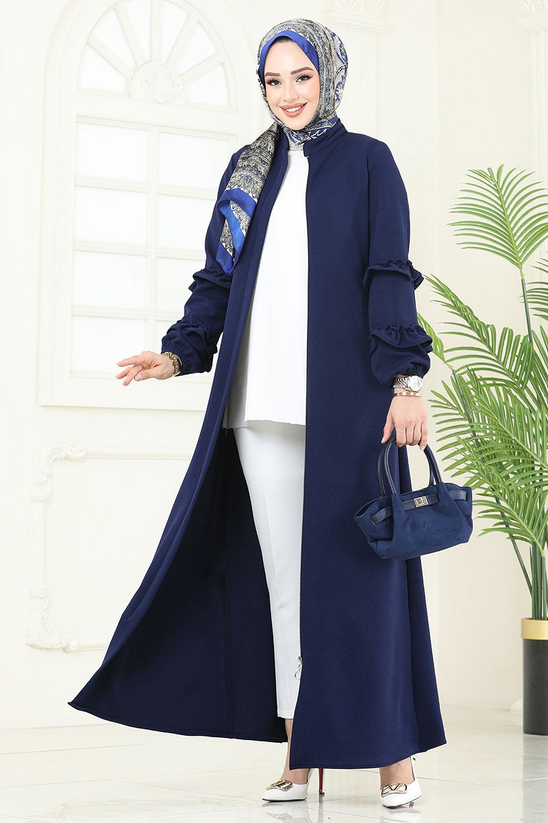 Elevate your style with the Ruffled Sleeve Ferace, a modest wear suitable for all seasons. This ferace can be gently washed at 30 degrees and is made from crepe fabric. It features a semi-mandarin collar, is unlined, and has a front zipper. With elasticated cuffs, this model offers both comfort and aesthetic appeal. Measurements: Height: 165 cm, Chest: 88 cm, Waist: 68 cm, Hips: 99 cm, Weight: 56 kg.