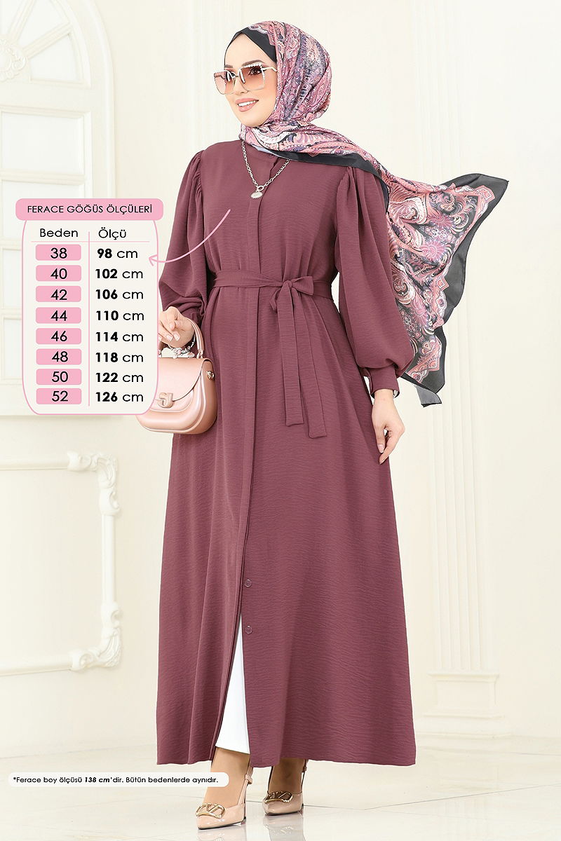 The Hidden Button Dress Abaya combines fashion and modest comfort, ensuring your elegance throughout all seasons. This ferace model, made of Aerobin fabric, can be easily cleaned with a gentle wash at 30 degrees. The half mandarin collar and hidden buttons provide a modern look, while its unlined design promises light and comfortable wear. The included belt can create different style options, and the active cuff buttons offer practical use. The removable belt and available pocket detail add functionality. Designed to fit all sizes, this ferace exemplifies with size 38 worn by the model.