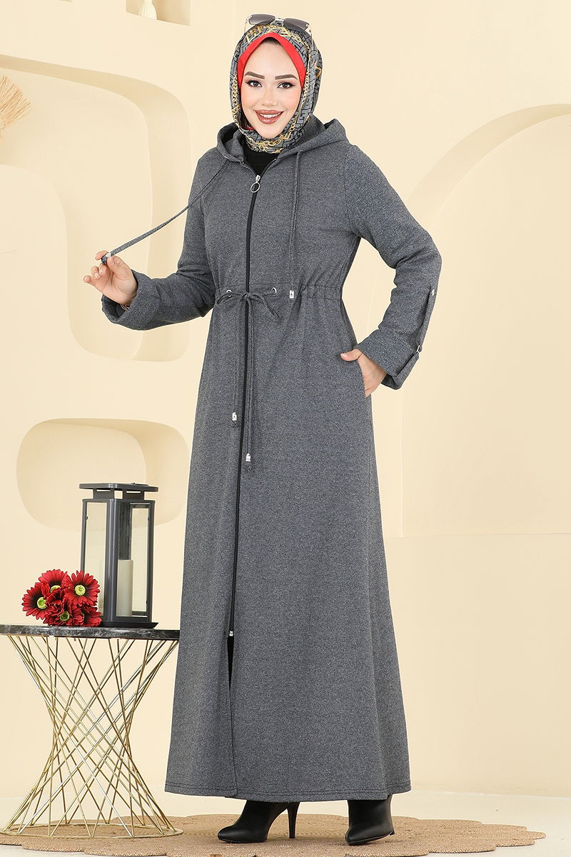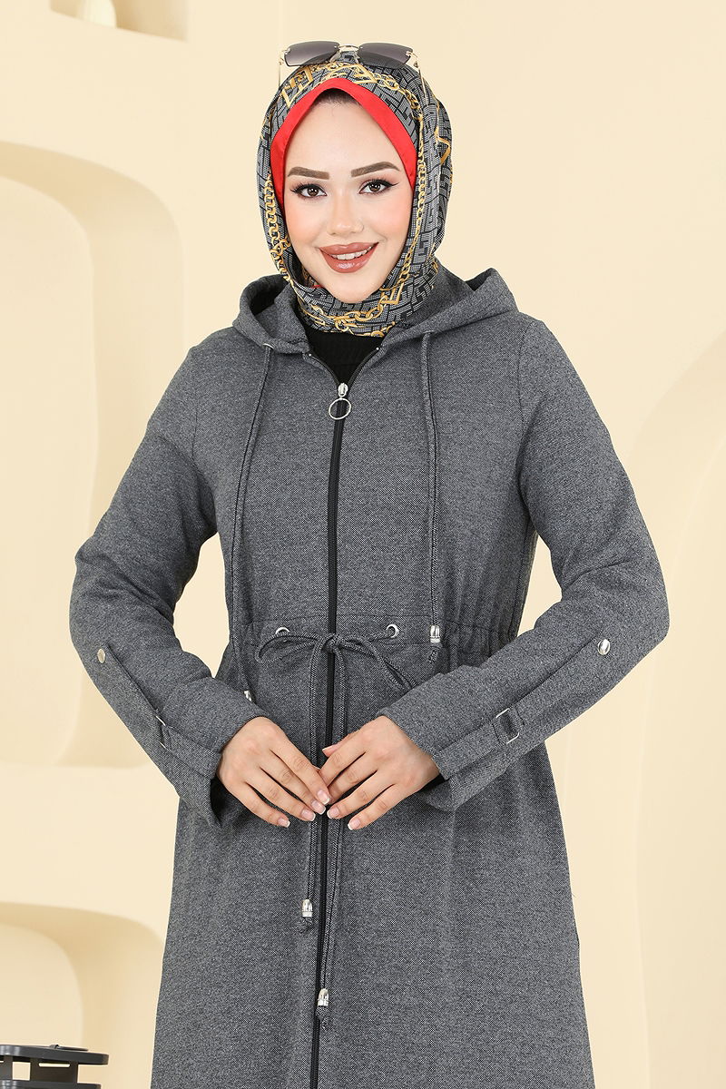 Product Feature : It is a new season hijab fashion product. There is a hidden pocket in the product. The sleeve cuff fold detail is stitched. It has a laced waist. The product has a Hooded collar. Unlined. The product has a zipper at the From the front part. The hood is sewn to the product. There may be a tonal difference in the product due to concept photo shoots.
