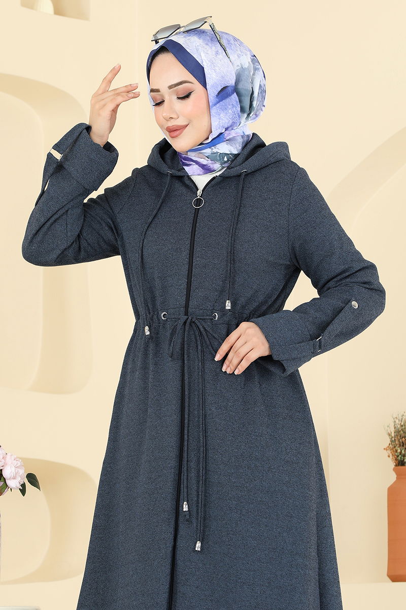 Product Feature : It is a new season hijab fashion product. There is a hidden pocket in the product. The sleeve cuff fold detail is stitched. It has a laced waist. The product has a Hooded collar. Unlined. The product has a zipper at the From the front part. The hood is sewn to the product. There may be a tonal difference in the product due to concept photo shoots.