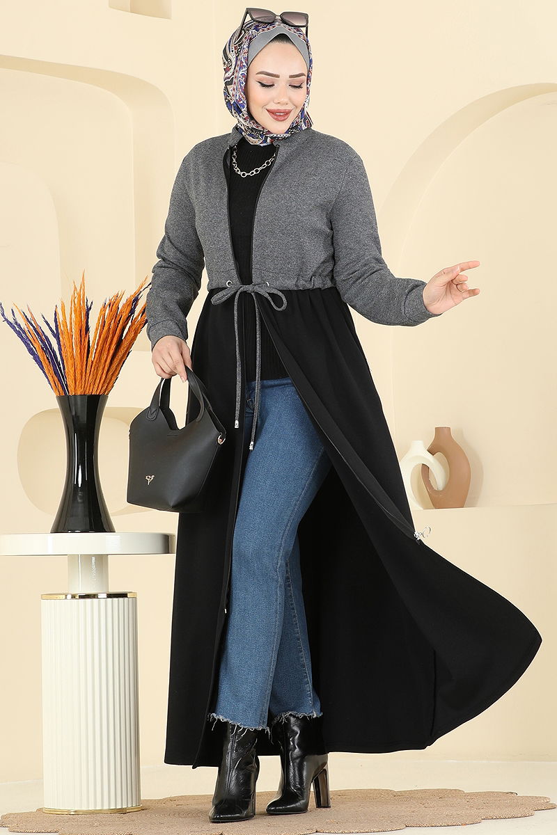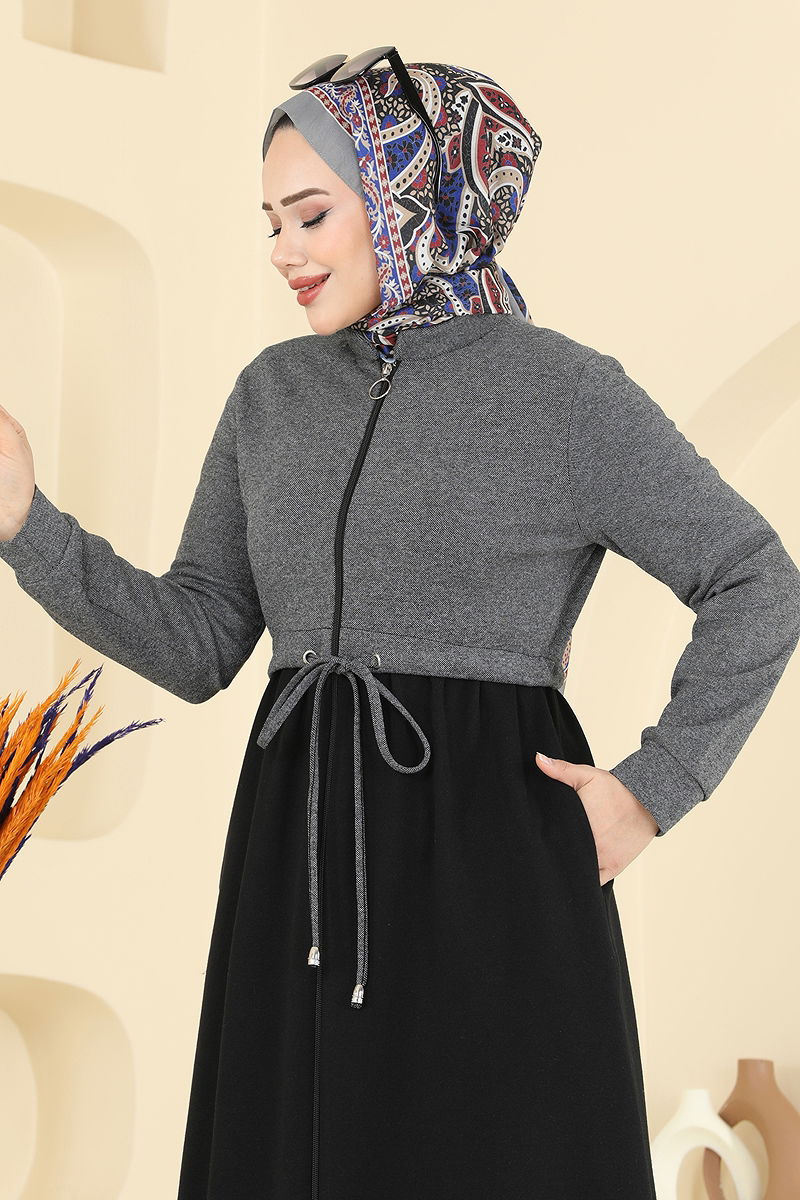 The Belt Tunnel Detailed Abaya offers comfort and elegance for autumn and winter. Made from tweed fabric, this abaya can be gently washed at 30 degrees. Its mandarin collar and unlined structure ensure comfortable wear. The product features a front zipper closure and detailed stitching for a contemporary look. The drawstring detail is optional, and the presence of a pocket adds practicality.