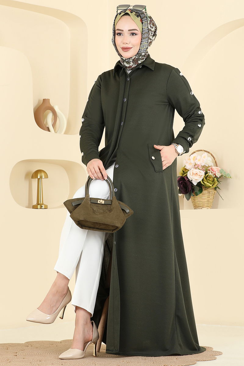 Elegant and functional, the Button Accessorized Knit Crepe Ferace is a modest wear model suitable for all seasons. This ferace, which can be gently washed at 30 degrees, is made from knit crepe fabric. It features a shirt collar and a lining-free design that provides a modern look. The accessible front buttons and hidden buttons offer practical usability. The buttons also serve as chic accessories. The piece includes pockets and active cuff buttons to enhance functionality. The product shown on the model is size 38.