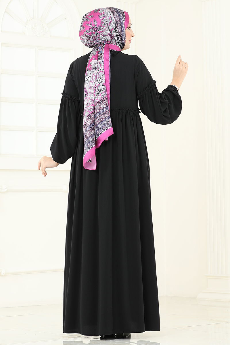 The Front-Zippered Medina Silk Abaya is a chic and comfortable Islamic clothing piece suitable for all seasons. This ferace, made from Medina Silk fabric, can be washed at 30 degrees on a gentle cycle. It features a bike collar and a lining-free design with a front zipper for practical and elegant wear. The tassel details and cord accents enhance its chic look, while its elastic cuffs and pockets add functionality. The showcased model is size 38 with a height of 165 cm.
