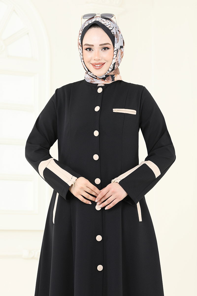 The Garni Detail Abaya is a specially designed modest wear garment. Suitable for all seasons, this ferace can be washed at 30 degrees with a gentle cycle. Made from high-quality woven Dabıl fabric, the coat features a semi stand-up collar design. This front-buttoned model offers a lightweight and comfortable experience with its unlined structure. It includes stylish pocket details as an accessory and active zippered cuffs. The product on display is size 40, perfectly tailored.