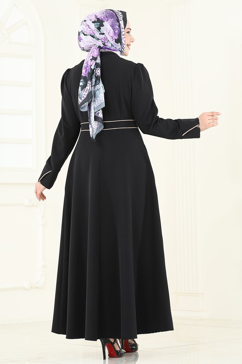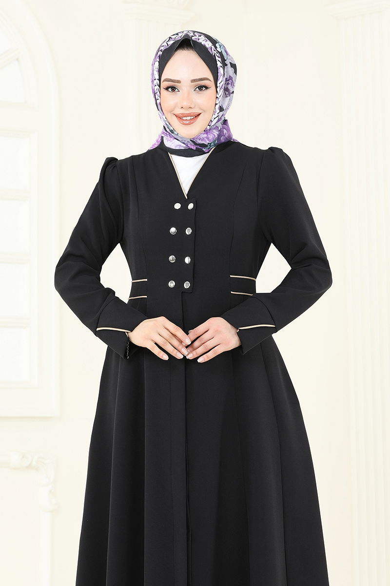 Front-Clip Abaya . This special model is ideal for those who love modest fashion. It can be comfortably worn in all four seasons and is washable at 30 degrees on a gentle cycle. Made from durable and stylish dabıl fabric, it features a V-neck design and hidden buttons for a fashionable choice. Its unlined structure makes it lightweight and comfortable. The product shown on the model is size 38 and comes with practical front clips.