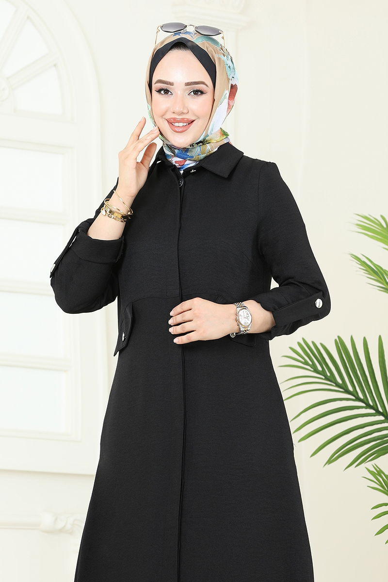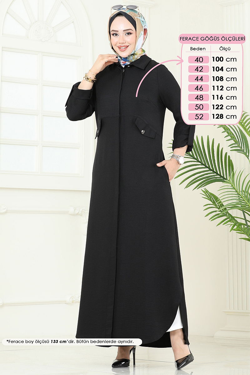 Our Ferace model hijab is comfortably usable in all seasons. You can wash it at 30 degrees with a gentle wash setting. It offers a comfortable experience with its hidden button and unlined design. The waist of the product is stitched, and stylish buttons are added as accessories. It features pockets and active cuff buttons for practical use.