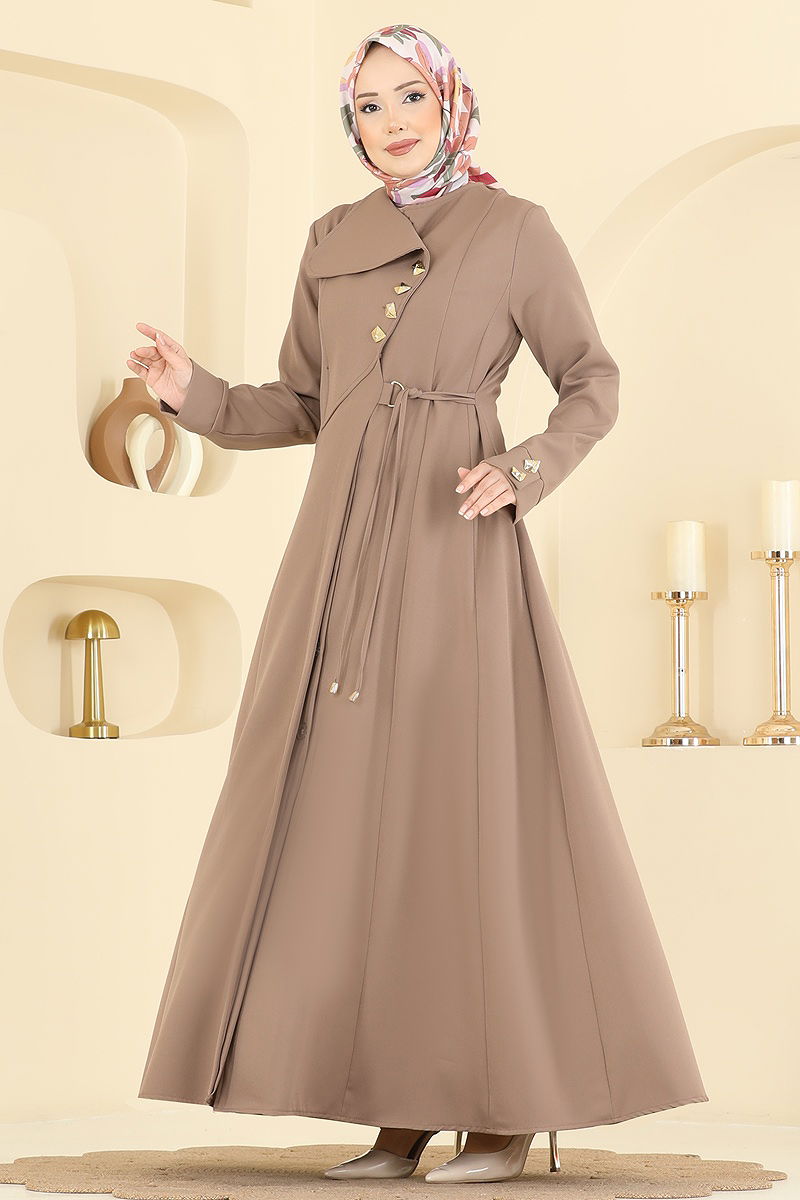 The Gold Buttoned Dabıl Ferace is an elegant option for modest attire. It can be comfortably worn across all seasons. This garment can be washed with a special gentle program at 30 degrees. It features an asymmetric crossover collar, is unlined, and has stylish cuff buttons, offering a striking appearance. The model is wearing size 38. The ferace has functional front buttons and hidden buttons, ensuring practical use. It also includes a tie that can be adjusted from the side and a hidden pocket detail.