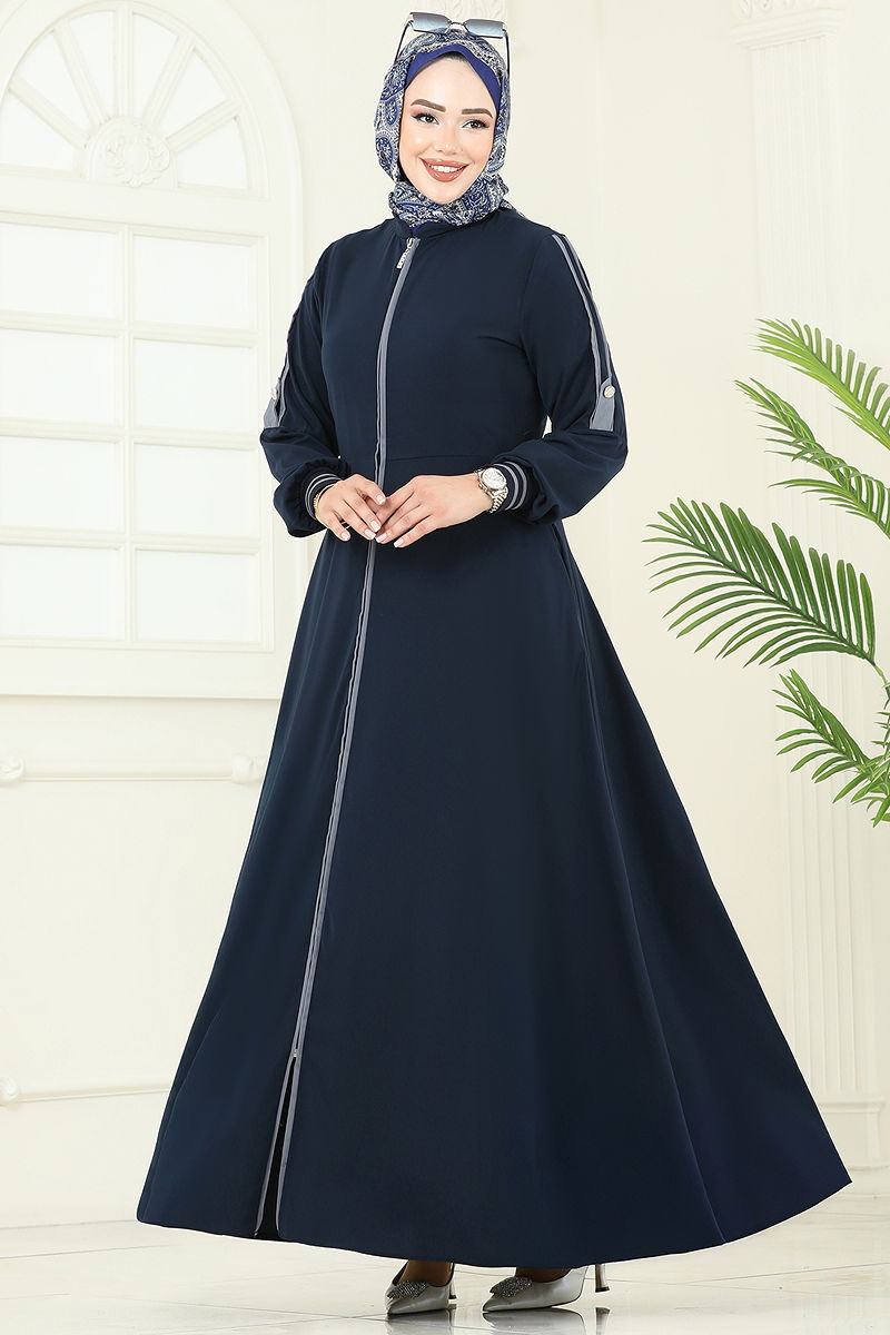 The Piped Detail Ferace is a stylish and practical garment designed specifically for women who prefer modest attire. Suitable for all seasons, this ferace can be washed at a gentle 30 degrees Celsius. Made from Medina silk fabric, this model offers a lightweight and comfortable experience without lining. The front zip design of the product adds a versatile elegance. It perfectly displays an ideal look with a standard size 38 on the model.