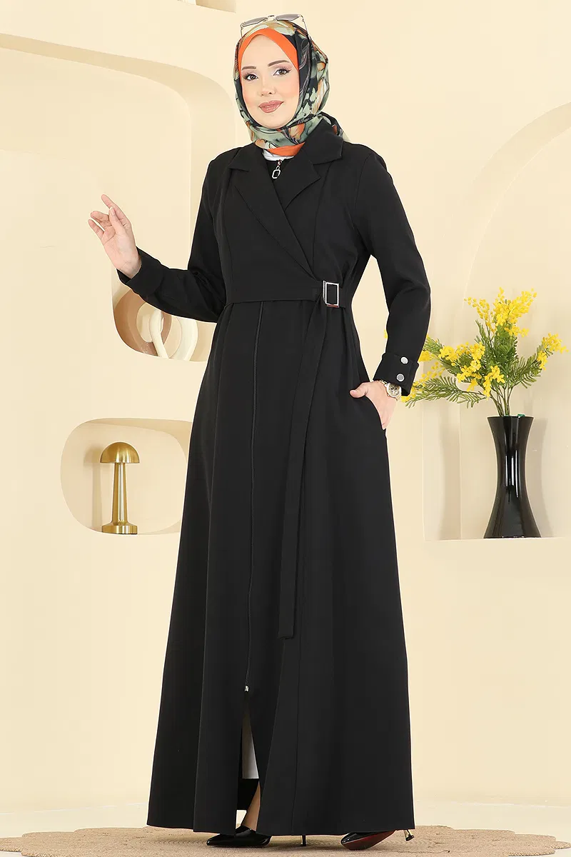 The Jacket Collar Dabıl Ferace is a modest clothing item suitable for all seasons. It can be washed at 30 degrees on a gentle cycle and is made from durable Dabıl fabric. The jacket collar adds a touch of elegance, while its lining-free design ensures lightness and comfort. Conveniently designed with a front zipper and hidden pocket details, it also features snap and buckle details that enhance its style. The product includes a sewn-in belt, offering a modern and chic silhouette.