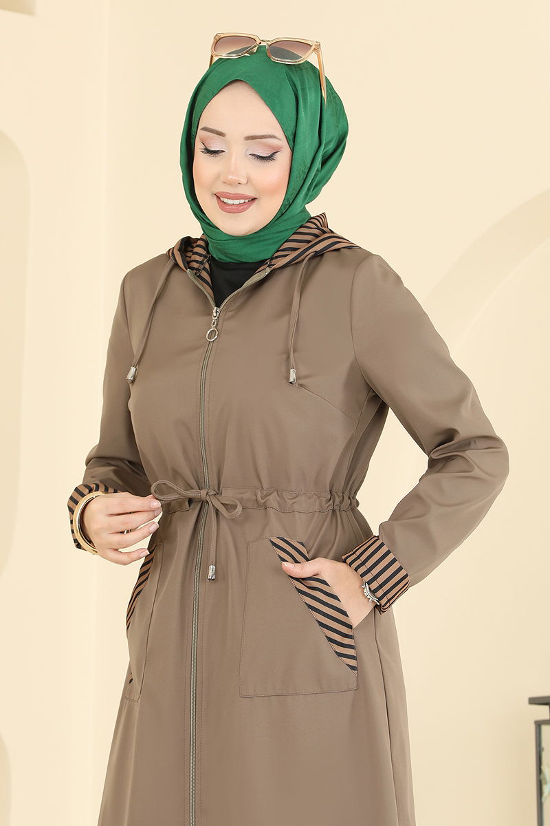 Product Feature : It is a new season hijab fashion product. It has a laced waist. The neck drawstring is active. The product has a Hooded collar. Unlined. The product has a zipper at the From the front part. Pocket available. There may be a tonal difference in the product due to concept photo shoots.