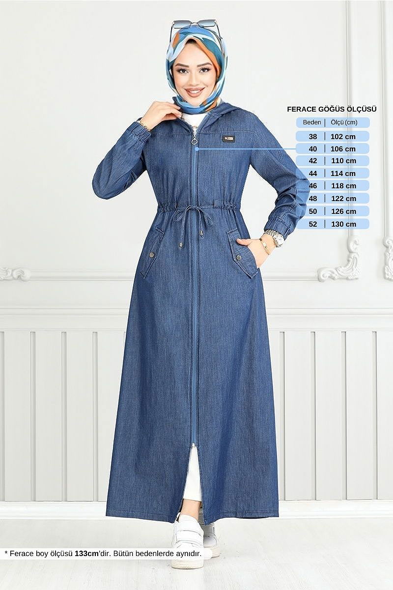 The Zip-Front Denim Ferace FERACE stands out with its all-season versatility and elegant design. Washable at 30 degrees on a gentle cycle, this ferace is perfect for both everyday wear and special occasions. The unique combination of Tencel denim fabric offers durability. Its hooded, lining-free design ensures supreme comfort. The frontal zipper makes it practical to wear, while the stitched badge detail adds an extra touch of elegance. Features like elastic cuffs and spacious pockets enhance its functionality. The product displayed is size 38.