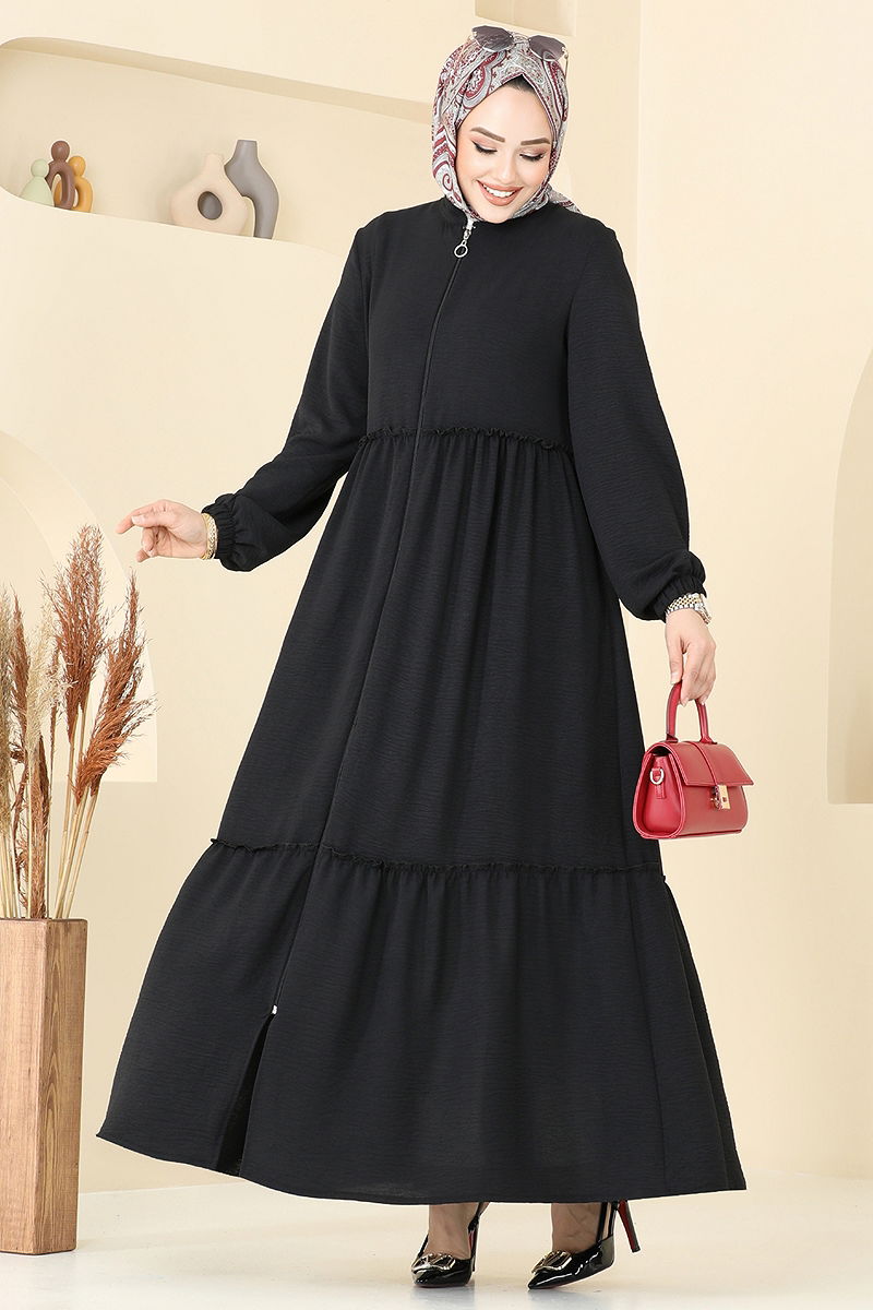 The Layered Skirt Abaya is a modest wear item crafted from aerobin fabric, suitable for all seasons. It can be washed at 30 degrees on a delicate cycle, highlighting its practical design. The product features a demi-mandarin collar, is unlined, and includes a front zipper, making it easy to wear and remove. It also has elastic cuffs, combining elegance with comfort. This model is displayed in size 38 with the following measurements: Height: 165 cm, Bust: 88 cm, Waist: 68 cm, Hips: 99 cm, Weight: 56 kg.