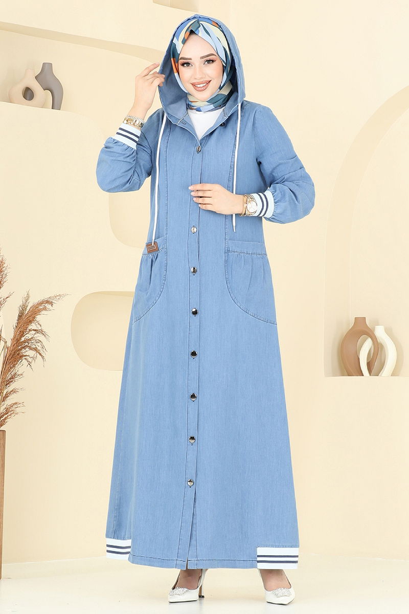 The Ribana Detailed Denim Abaya is an ideal choice for hijab fashion suitable for all seasons. This item can be washed gently at 30 degrees and is made from durable denim. It features a hooded and buttoned design that combines elegance with comfort. The unlined structure makes it lightweight and practical, while the arm patch detail and pockets add functional class to any setting.