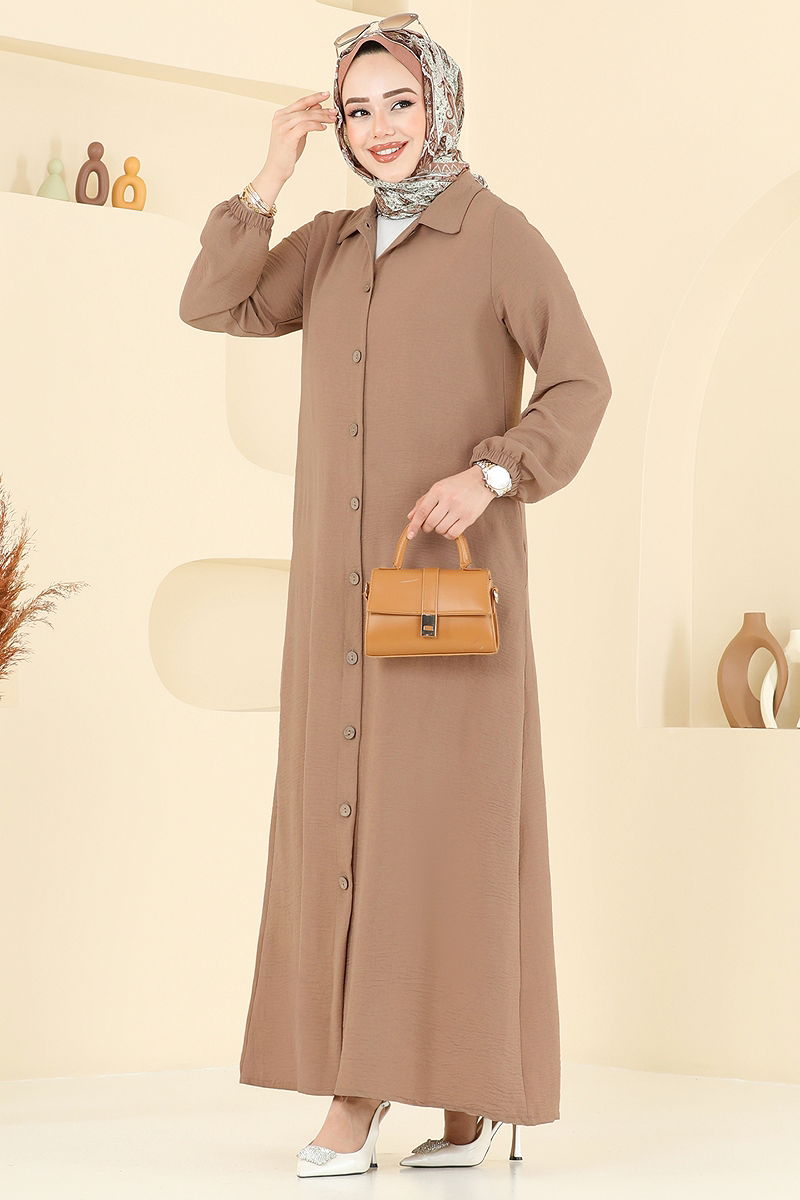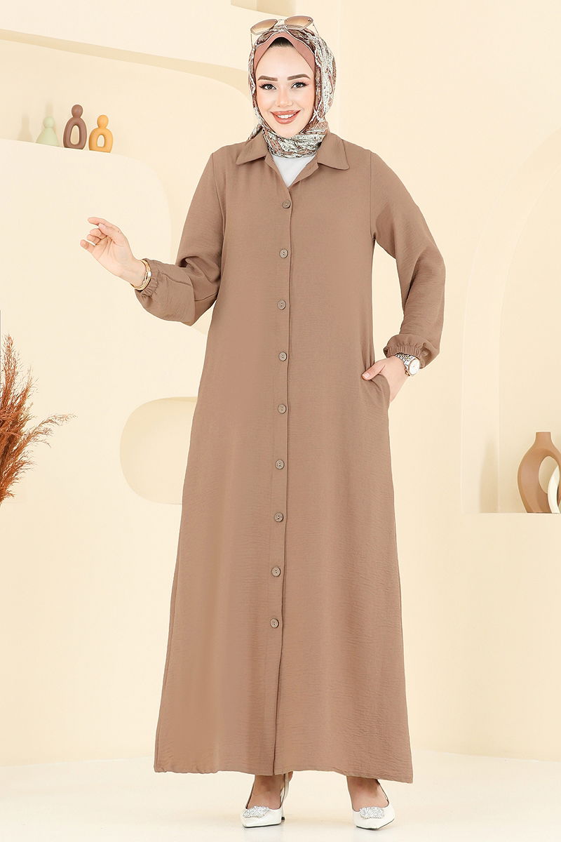 The Button-Front Modest Abaya is crafted from aerobin fabric, suitable for all seasons. It can be washed gently at 30 degrees. Its shirt collar and buttoned design offer a modern look. The unlined structure, elastic cuff details, and pocketed design provide practical use. The product size on the model is 38-40 with measurements: Height: 165 cm, Chest: 88 cm, Waist: 68 cm, Hips: 99 cm, Weight: 56 kg.