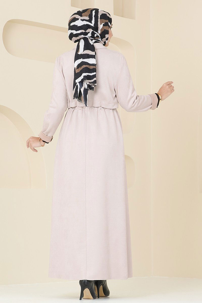 It can be used in Autumn and Winter seasons. It should be washed at 30 degrees without squeezing. It is made of first-class Suede fabric. The product has a shirt collar. The product is front-wearable and half-buttoned. It is unlined. (The product on the model is size 38.) It has a front-usable zipper and a pocket. It has a drawstring waist.