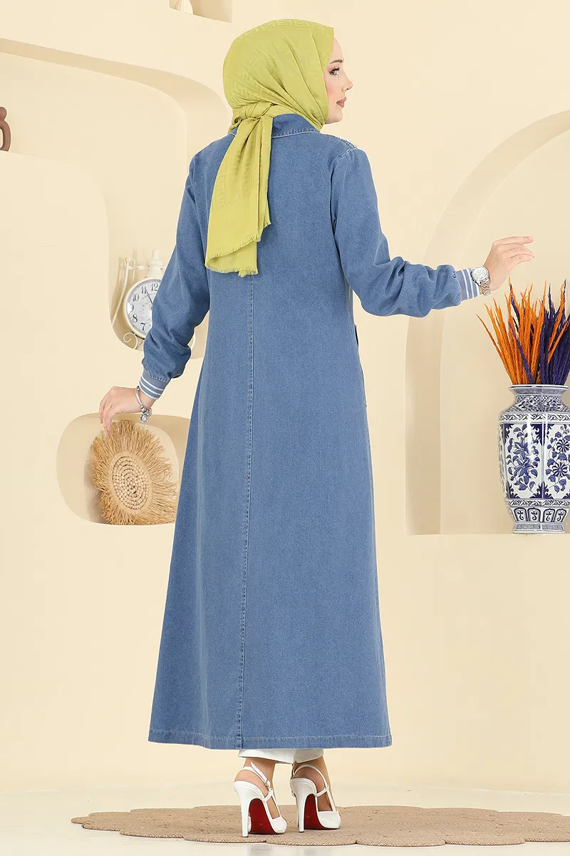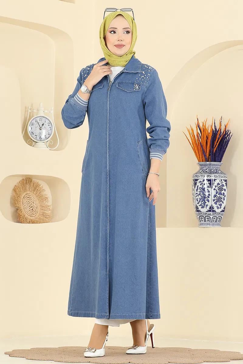 The Stone Embellished Denim Ferace combines elegance and comfort in one unique design, suitable for all seasons. It can be washed at 30 degrees with gentle care and features a shirt collar and front zipper, making it practical to wear. The unlined design ensures a light and comfortable experience, while the clinched stone details add a striking look. Functional pocket detail enhances usability.