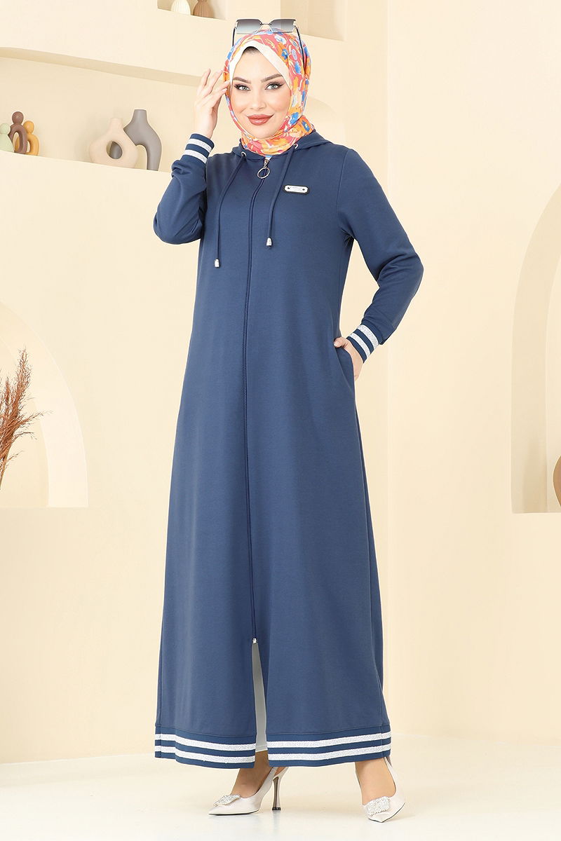 The Abaya a hijab product suitable for all-season use. It can be washed gently at 30 degrees and is made from dual-thread fabric. Featuring a hooded design and a zippered front, it offers practical and stylish use. The unlined structure, along with the sewn badge details and permanent hood, make it visually appealing. Measurements of the model: Height 167 cm, Chest 90 cm, Waist 70 cm, Hips 100 cm, Weight 59 kg. This model also includes convenient pockets.
