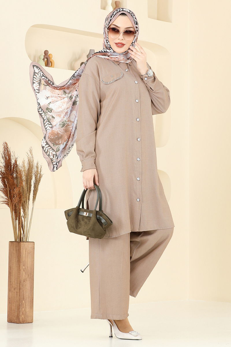 Rahat ve şık tasarımıyla dört mevsim kullanabileceğiniz İncili Keten Takım, tesettür modasının öne çıkan parçalarından biridir. Hassas yıkama ile 30 derecede yıkanabilen bu ürün, tensel kot kumaştan üretilmiştir. Gömlek yakalı ve önden düğmeli tunik, yandan yırtmaç detayları ile hareket özgürlüğü sunar. Pantolon ise lastik beli sayesinde konforlu bir kullanım sağlar. İnci detayları ile zarafet katan bu kombininin cepleri aksesuar amaçlıdır, manşet düğmeleri ise aktiftir. Bluz dahil değildir. Modelin üzerindeki ürün 38 bedendir ve örnek kombin olarak sunulmuştur.