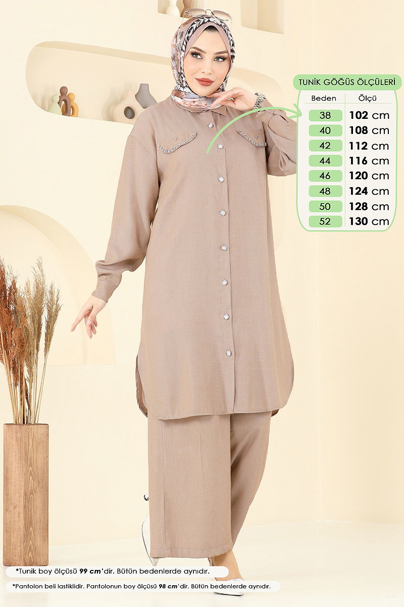 Ürün Özelliği : Yeni sezon tesettür moda ürünüdür. Ürün Gömlek yakadır. Ürün Önden düğmelidir. Tunik yandan yırtmaçlıdır.. Astarsızdır. İnci detayları çakımdır. Bluz ürüne dahil değildir. Ürün kullanım amacını göstermek için bluz ile örnek kombin yapılmıştır. Cep detayları aksesuardır. Pantolon beli lastiklidir. Manşet düğmeleri aktiftir. Konsept fotoğraf çekimlerinden dolayı üründe ton farklılığı olabilir.