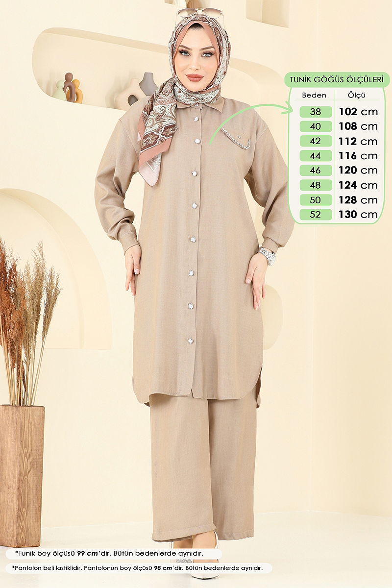 Rahat ve şık tasarımıyla dört mevsim kullanabileceğiniz İncili Keten Takım, tesettür modasının öne çıkan parçalarından biridir. Hassas yıkama ile 30 derecede yıkanabilen bu ürün, tensel kot kumaştan üretilmiştir. Gömlek yakalı ve önden düğmeli tunik, yandan yırtmaç detayları ile hareket özgürlüğü sunar. Pantolon ise lastik beli sayesinde konforlu bir kullanım sağlar. İnci detayları ile zarafet katan bu kombininin cepleri aksesuar amaçlıdır, manşet düğmeleri ise aktiftir. Bluz dahil değildir. Modelin üzerindeki ürün 38 bedendir ve örnek kombin olarak sunulmuştur.