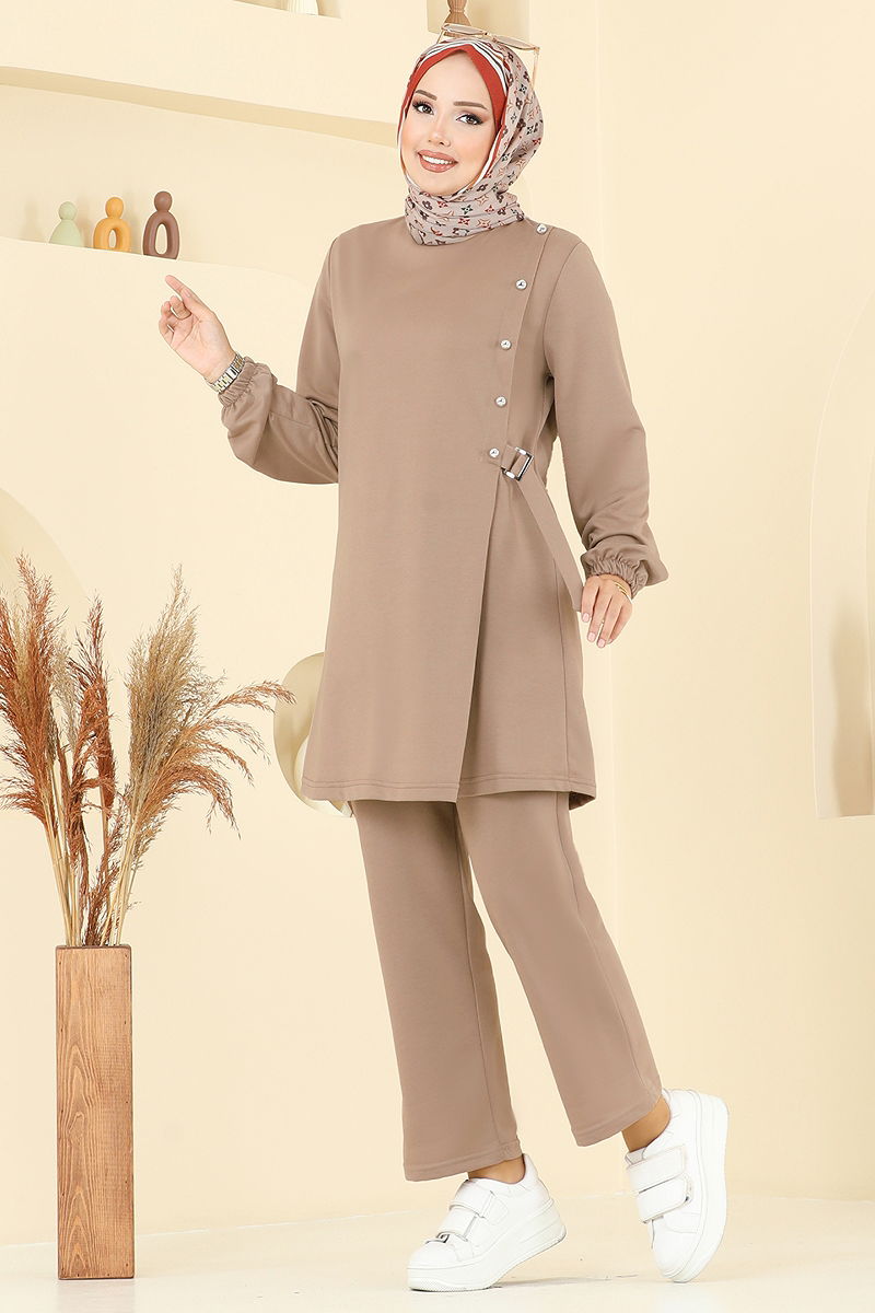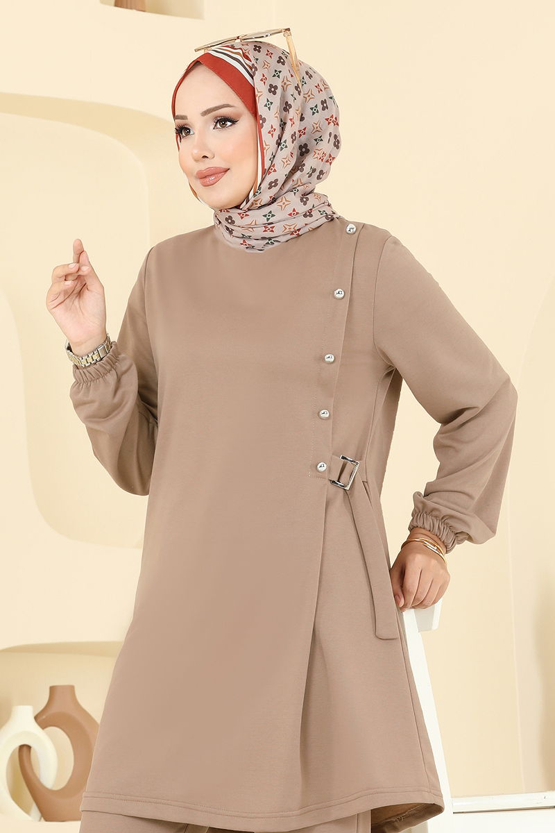Ürün Özelliği : Yeni sezon tesettür moda ürünüdür. Sırttan kullanılabilir bir düğmesi bulunmaktadır. Ürün Bisiklet yakadır. Astarsızdır. Düğmeler aksesuardır. Pantolon beli lastiklidir. Manşet lastiklidir. Konsept fotoğraf çekimlerinden dolayı üründe ton farklılığı olabilir.