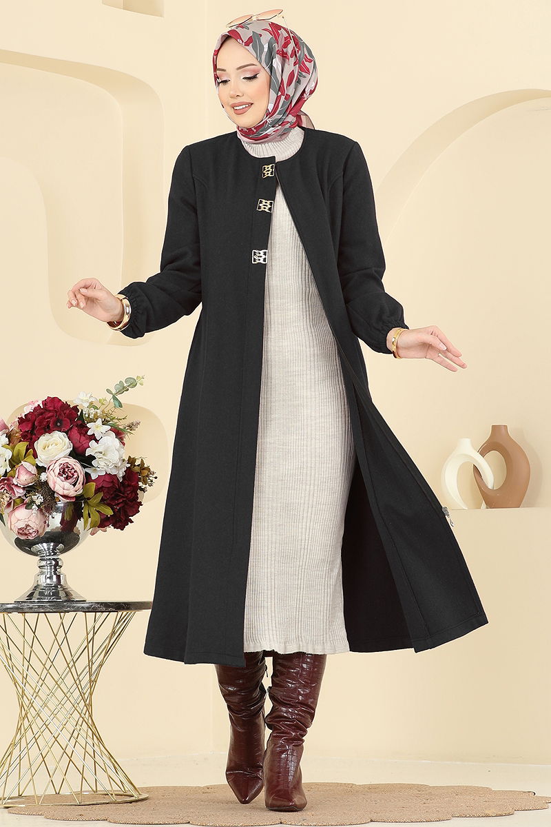Aksesuar Detaylı Kaşe Kaban Siyah
