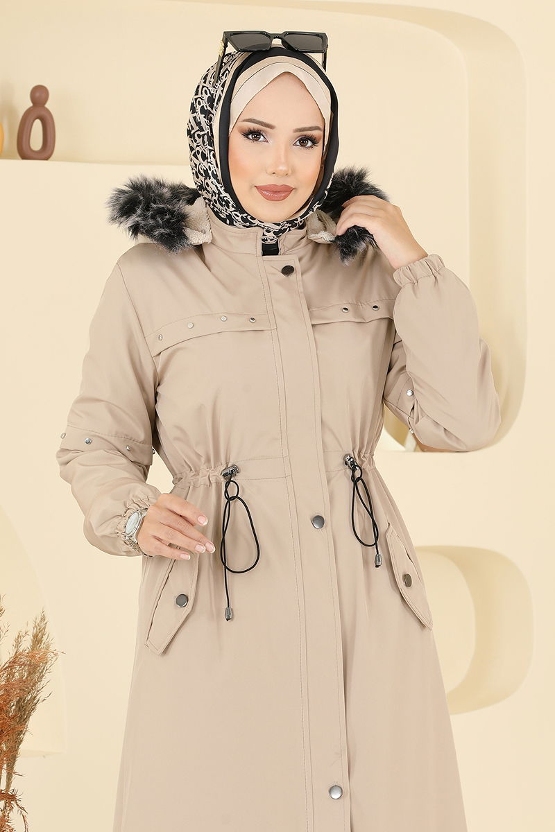 Aksesuar Detaylı Kürklü Kaban Bej