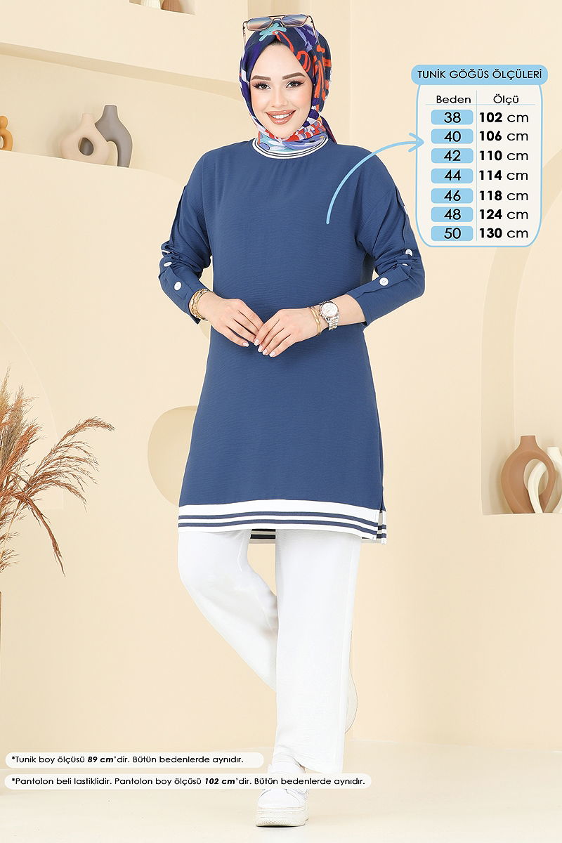 Ürün Özelliği : Yeni sezon tesettür moda ürünüdür. Ürün Bisiklet yakadır. Tunik yandan yırtmaçlıdır.. Astarsızdır. Düğmeler aksesuardır. Pantolon beli lastiklidir. Konsept fotoğraf çekimlerinden dolayı üründe ton farklılığı olabilir.