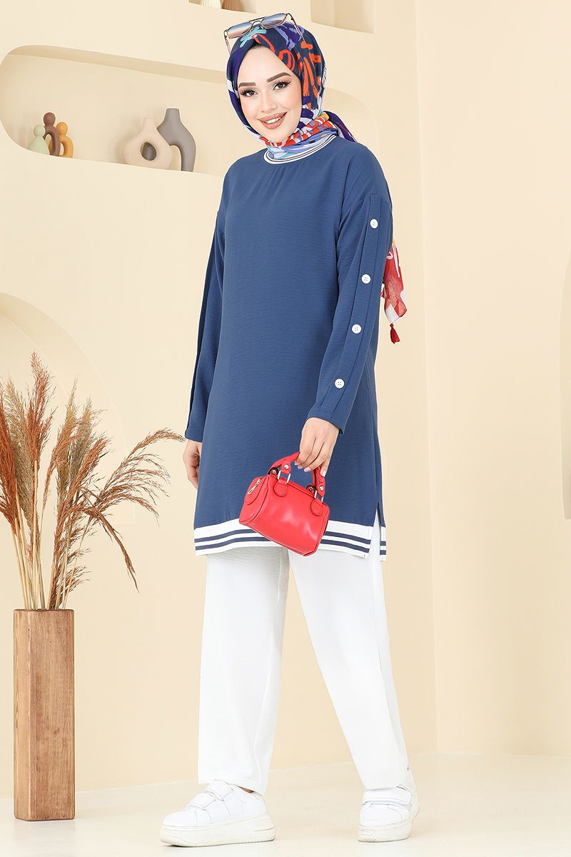 Aksesuarlı Aerobin Takım Kombin modelimiz, özellikle tesettür giyim tercih eden bayanlar için özel olarak tasarlanmıştır. Aerobin kumaştan üretilen bu ürün, dört mevsim rahatlıkla kullanılabilir. Tunik, bisiklet yaka ve yanlarda şık yırtmaçlarla modern bir görünüm sağlarken, pantolonun elastik beli maksimum konfor sunar. Düğmeler sadece aksesuar olarak yer almakta ve bu parça hassas yıkama ile 30 derecede yıkanabilir. Görseldeki mankenin üzerindeki ürün 38 bedendir.
