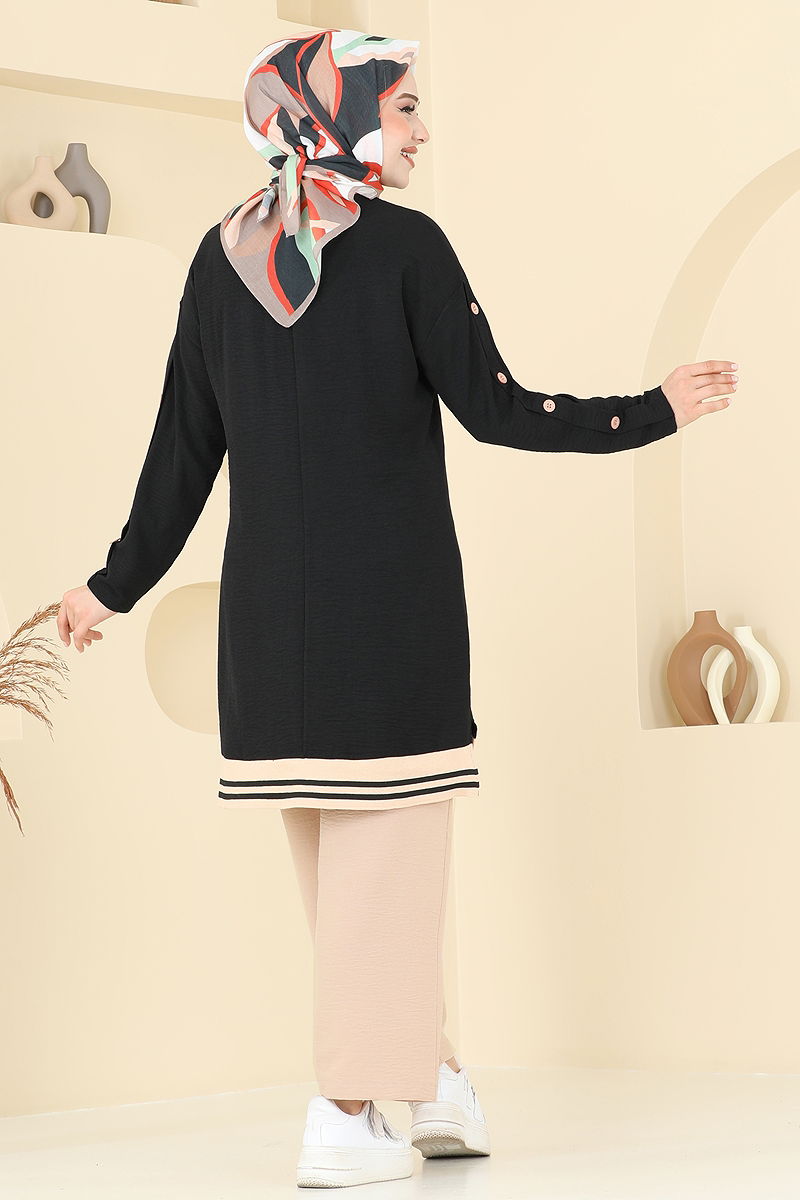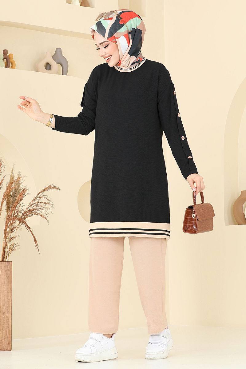 Aksesuarlı Aerobin Takım Kombin modelimiz, özellikle tesettür giyim tercih eden bayanlar için özel olarak tasarlanmıştır. Aerobin kumaştan üretilen bu ürün, dört mevsim rahatlıkla kullanılabilir. Tunik, bisiklet yaka ve yanlarda şık yırtmaçlarla modern bir görünüm sağlarken, pantolonun elastik beli maksimum konfor sunar. Düğmeler sadece aksesuar olarak yer almakta ve bu parça hassas yıkama ile 30 derecede yıkanabilir. Görseldeki mankenin üzerindeki ürün 38 bedendir.