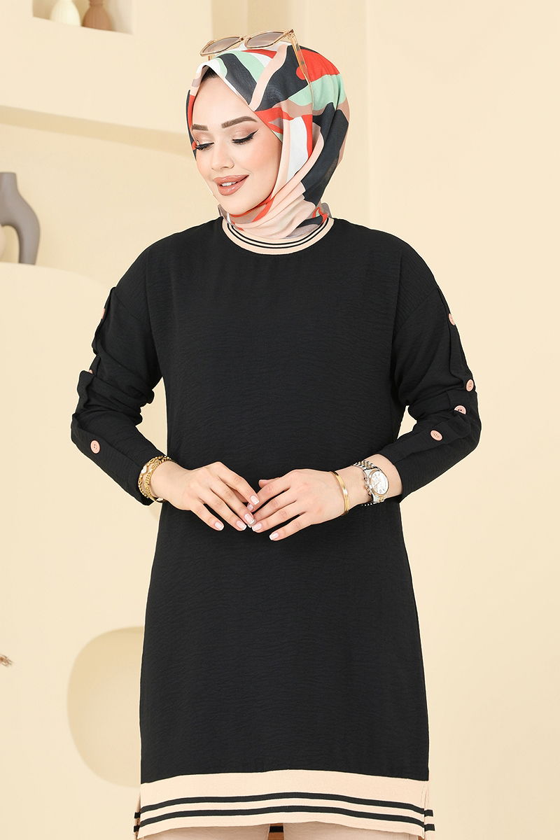 Ürün Özelliği : Yeni sezon tesettür moda ürünüdür. Ürün Bisiklet yakadır. Tunik yandan yırtmaçlıdır.. Astarsızdır. Düğmeler aksesuardır. Pantolon beli lastiklidir. Konsept fotoğraf çekimlerinden dolayı üründe ton farklılığı olabilir.