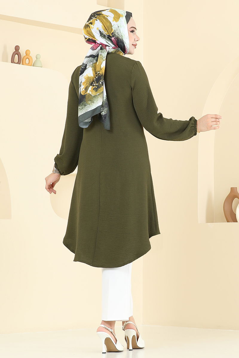 يوجد زر يمكن استخدامه من الخلف. المنتج لديه ياقة دائرية. غير مبطنة. الأزرار هي إكسسوارات. السوار مطاطي. قد يكون هناك اختلاف في الدرجة اللونية في المنتج بسبب التقاط الصور الفوتوغرافية.