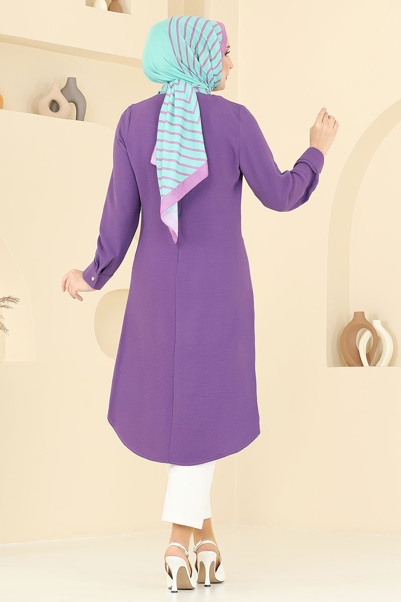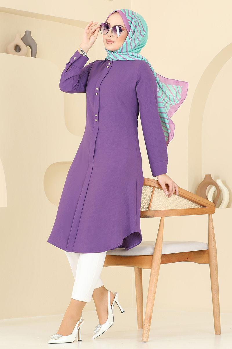 Product Name: Accessory Buttoned Aerobin Tunic. This chic and modern model is a modest clothing option that can be comfortably used across all four seasons. Its special aerobin fabric offers comfort with its lightweight and breathable structure. The bike neck and the active buttons on the cuffs add elegance to its look. It can be washed gently at 30 degrees and its lining-free design provides excellent usability. (The product on the model is size 38.)