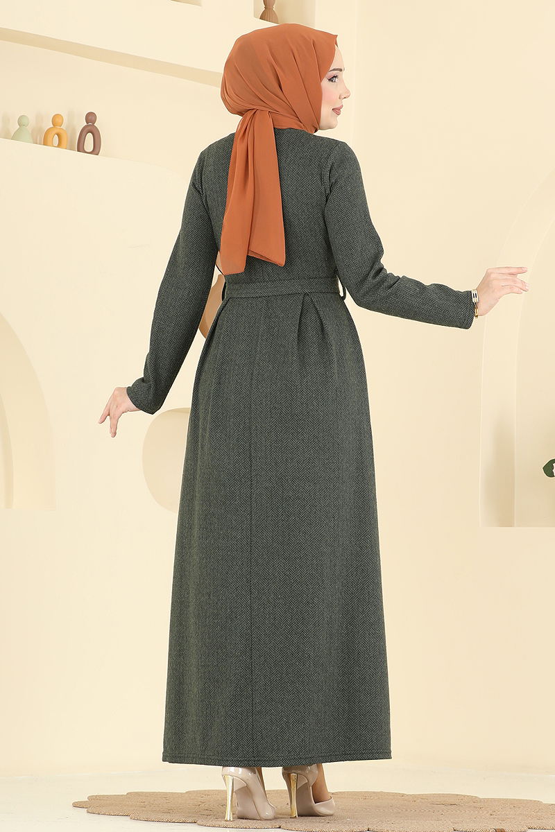 Aksesuar Düğmeli Balıksırtı Elbise 24016UKB139 Haki