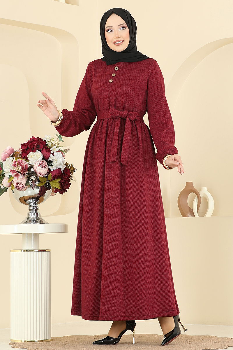 Aksesuar Düğmeli Balıksırtı Elbise Bordo