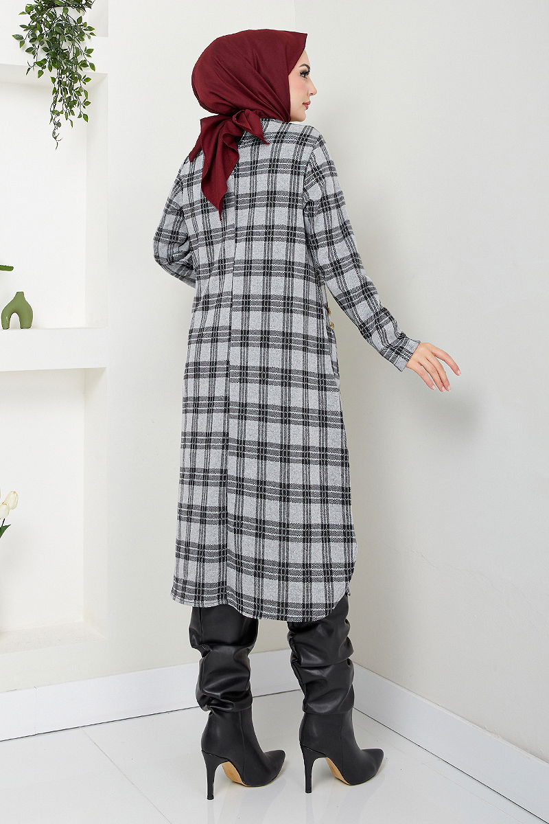 Accessory Buttoned Plaid Tunic is a model of hijab product. It can be used in Fall and Winter season. It should be washed at 30 degrees without squeezing. The product has a bicycle collar. The slit buttons are accessories. It is unlined. (The product on the model is size 38.) It has a button at the back for use. There is a pocket.