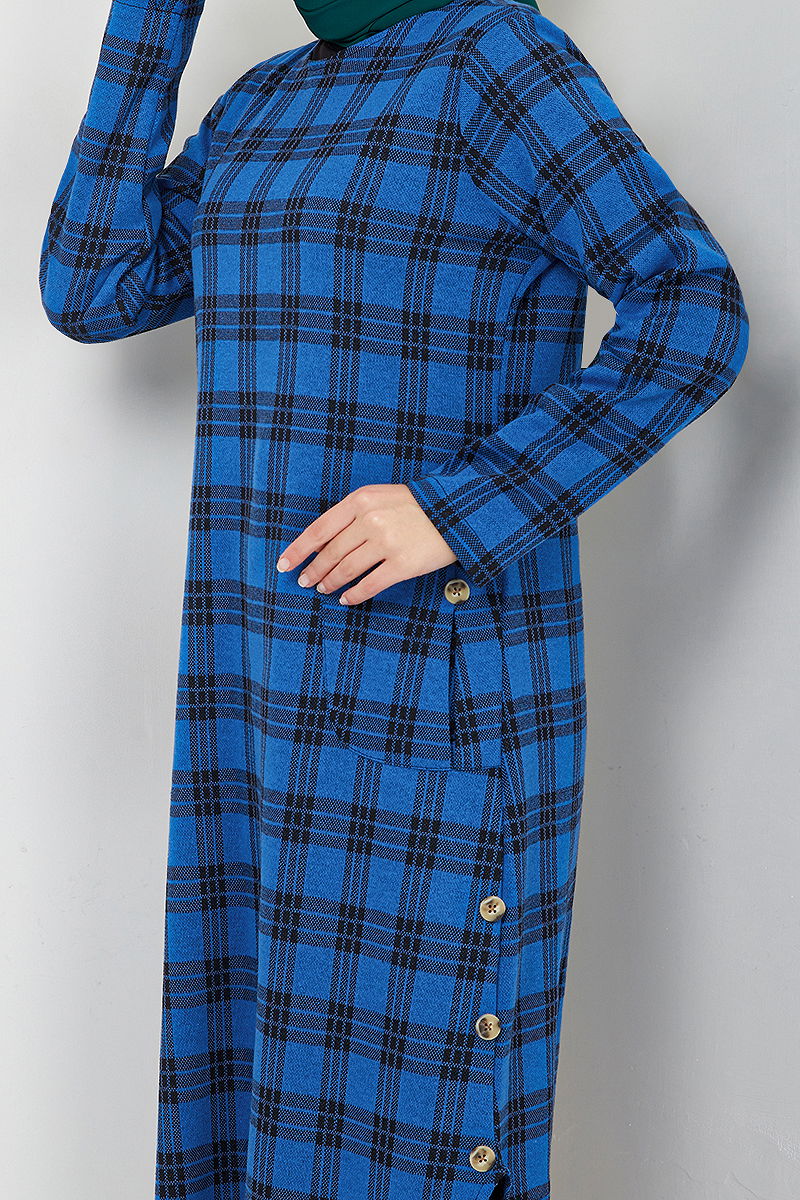 Accessory Buttoned Plaid Tunic is a model of hijab product. It can be used in Fall and Winter season. It should be washed at 30 degrees without squeezing. The product has a bicycle collar. The slit buttons are accessories. It is unlined. (The product on the model is size 38.) It has a button at the back for use. There is a pocket.
