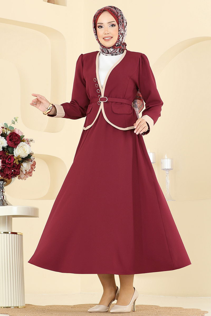 Aksesuar Düğmeli Etekli Takım Bordo