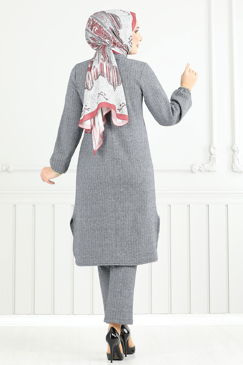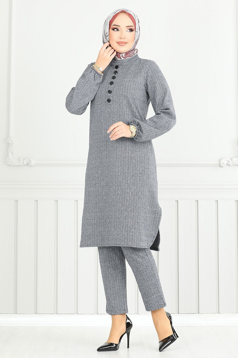 Aksesuar Düğmeli İkili Takım , sonbahar ve kış sezonları için ideal bir tesettür ürünüdür. 30 derecede hassas yıkama özelliği sayesinde kolayca temizlenebilir. Balıksırtı kumaştan üretilen bu şık takım, hakim yaka tuniği ve yandan yırtmaçlı tasarımı ile dikkat çeker. Astarsız olan bu kombin, rahatlığı ve şıklığı bir arada sunar. Ürün 38 bedendir ve modelin boyu 165 cm, göğüs 80 cm, bel 68 cm, basen 96 cm, kilo 54 kg'dır. Tunik sırttan fermuar ve düğme detaylarına sahipken, pantolonun beli ve manşetleri lastiklidir, size gün boyu konfor sağlar.