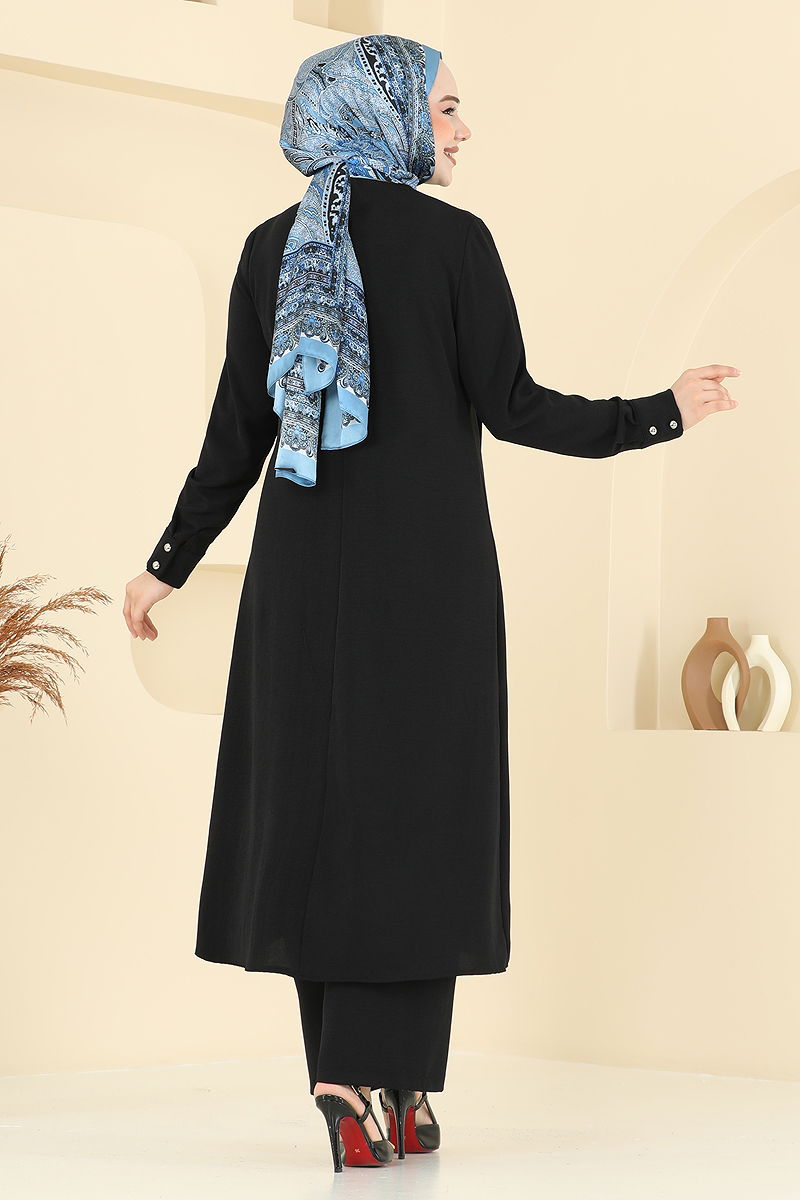 Aksesuar Düğmeli İkili Takım modeli, tesettür giyim tarzına uygun, dört mevsim rahatlıkla kullanılabilecek bir üründür. Aerobin kumaştan üretilmiş olan bu takım, bisiklet yaka ve yırtmaç detayları ile dikkat çeker. Astarsız yapısı, sırtından erişilebilen fonksiyonel bir düğme ve aksesuar amaçlı şık düğmeleri ile tamamlanmıştır. Pantolonun elastik beli, tunikle beraber konforlu bir kullanım sunar. Manşetlerde bulunan aktif düğmeler ise kullanışlılığı artırır. Bu şık ve fonksiyonel ikili takım, 30 derecede hassas yıkama ile temizlenebilir.