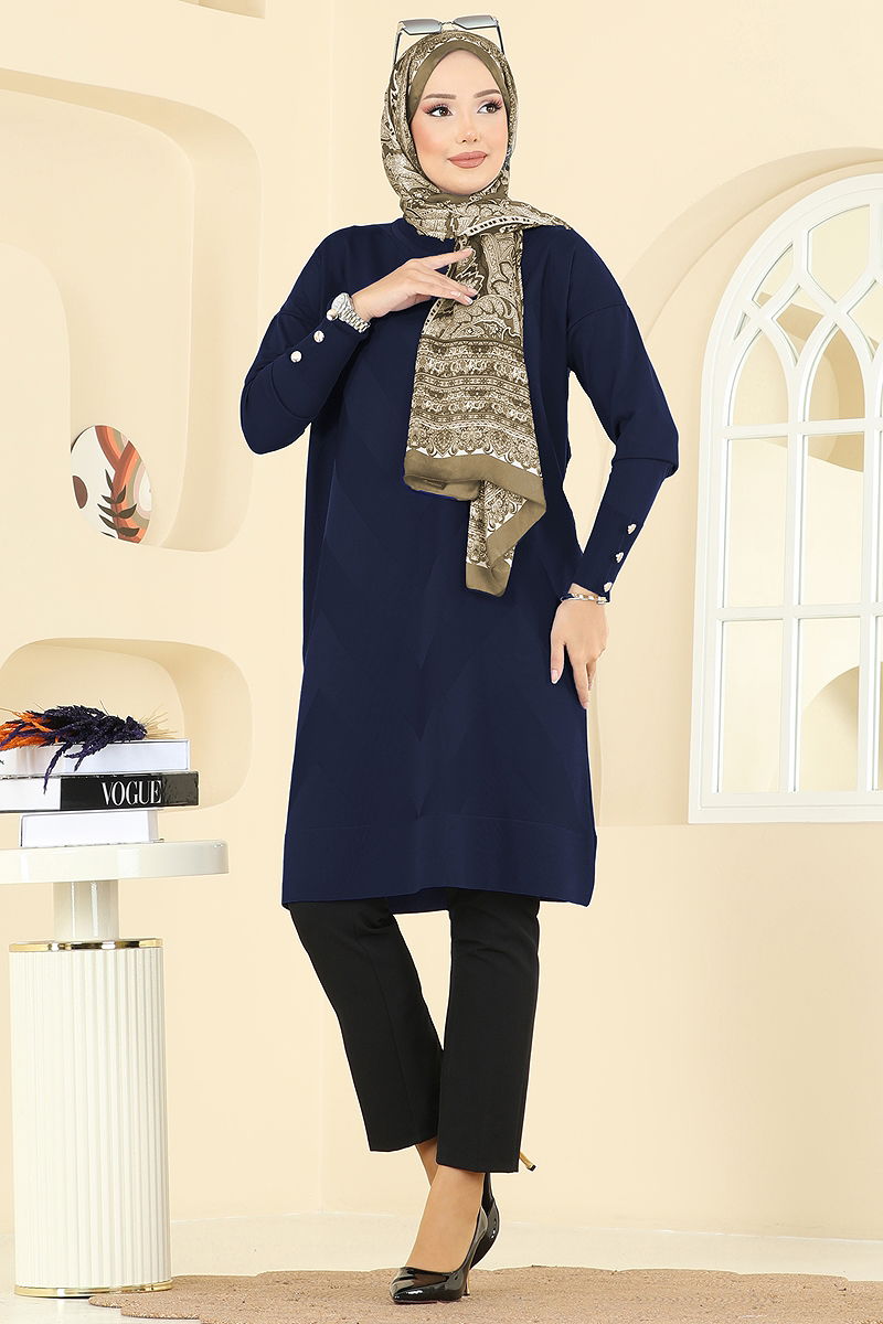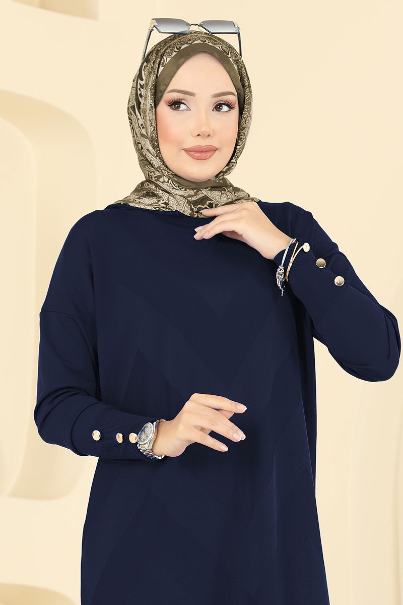 Manşeti Aksesuar Düğmeli Triko Tunik, başta tesettür giyim tercihleri olanlar için özel olarak tasarlanmıştır. Sonbahar ve Kış aylarında kullanım için ideal olan bu tunik, hassas 30 derece sıcaklıkta yıkanabilme özelliği ile dikkat çeker. Bisiklet yaka tasarımı ve standart beden yapısı (36-38-40-42-44-46) ile çoğu vücut tipine uyum sağlar. Manşetleri şık birer aksesuar olarak düşünülen düğmelerle süslenmiştir. Merserize triko kumaş kullanımı, ürüne ekstra konfor ve dayanıklılık katmaktadır.
