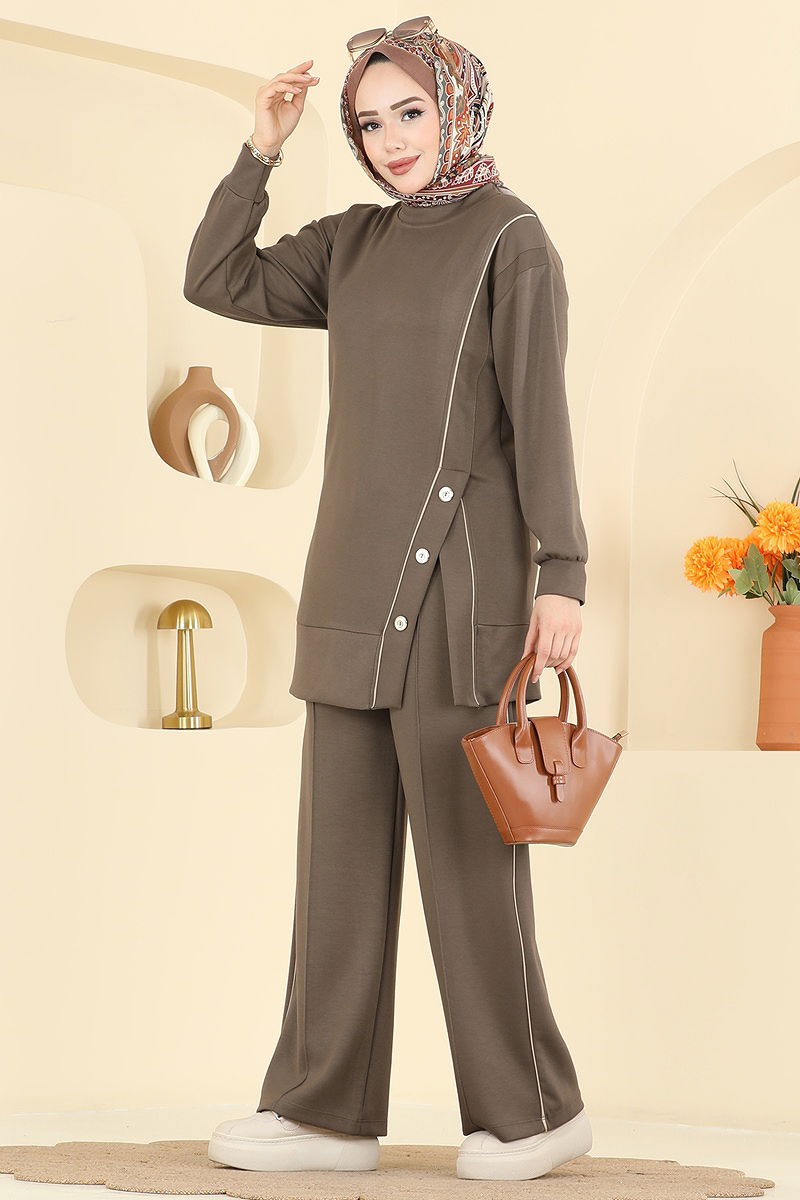 Aksesuar Düğmeli Modal Takım KOMBİN, dört mevsim rahatlıkla kullanılabilen bir tesettür ürünüdür. Hassas yıkama özelliği ile 30 derecede yıkanabilen bu ürün, modal kumaştan üretilmiştir ve uzun ömürlüdür. Bisiklet yaka ve önden düğmeli tasarımı ile modern bir görünüm sunar. Tunik, ön yırtmaç detayı ile hareket özgürlüğü sağlarken, pantolonun lastikli beli konfor sunar. Aksesuar detayları ise ürüne şık bir dokunuş katmaktadır. Modelin üzerindeki 38 beden örnek teşkil etmektedir.