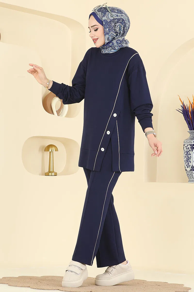 Aksesuar Düğmeli Modal Takım KOMBİN, dört mevsim rahatlıkla kullanılabilen bir tesettür ürünüdür. Hassas yıkama özelliği ile 30 derecede yıkanabilen bu ürün, modal kumaştan üretilmiştir ve uzun ömürlüdür. Bisiklet yaka ve önden düğmeli tasarımı ile modern bir görünüm sunar. Tunik, ön yırtmaç detayı ile hareket özgürlüğü sağlarken, pantolonun lastikli beli konfor sunar. Aksesuar detayları ise ürüne şık bir dokunuş katmaktadır. Modelin üzerindeki 38 beden örnek teşkil etmektedir.