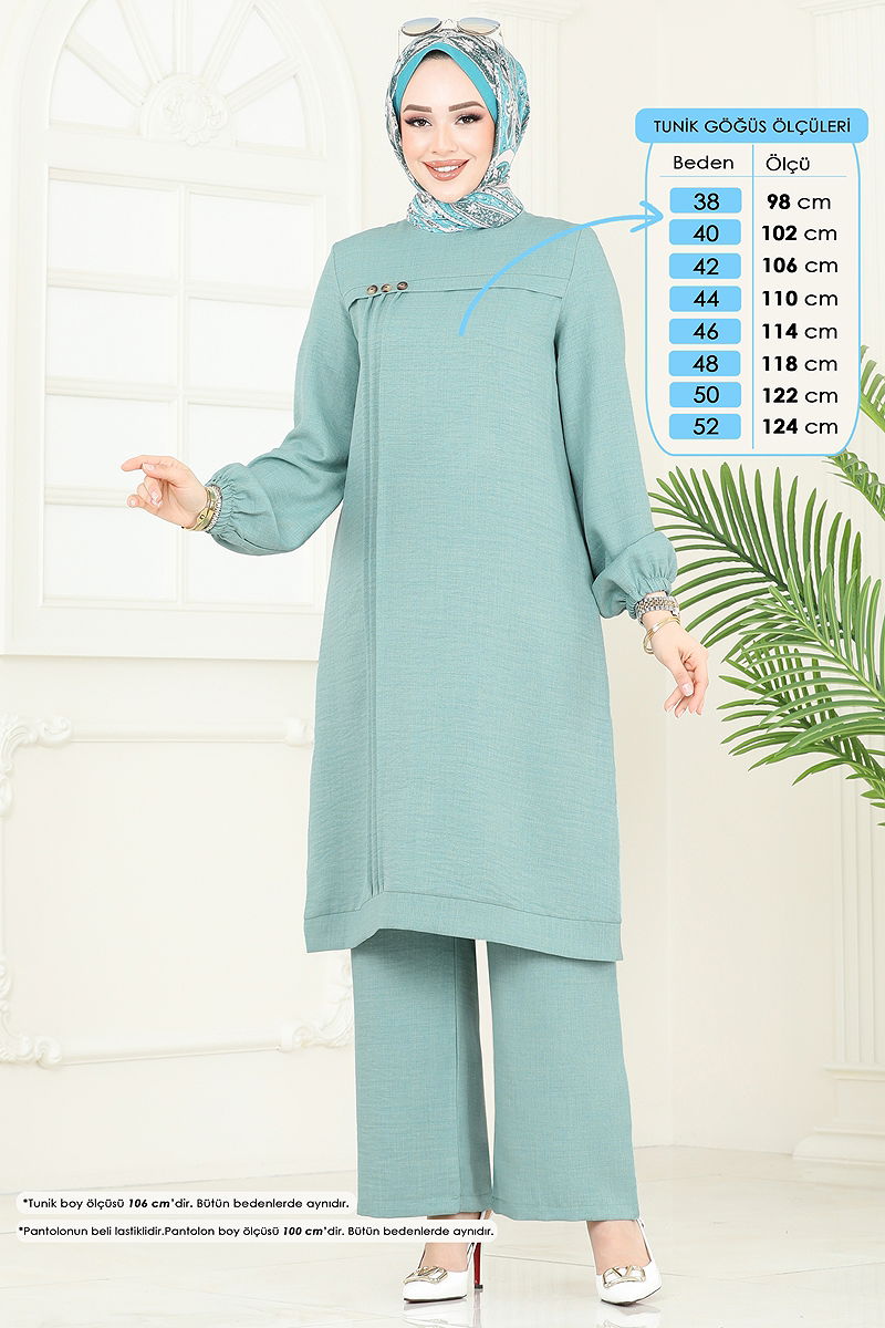 Aksesuar Düğmeli Keten Takım modelimiz, sofistike bir tasarım ile dört mevsim rahatlık ve şıklığı bir arada sunar. 30 derecede hassas yıkama ile temizlenebilen bu tesettür ürün, Sofia keten kumaştan üretilmiştir. Bisiklet yaka kesimi ve astarsız yapısıyla konforlu bir kullanım sağlar. Tunik boyu 165 cm, göğüs 88 cm, bel 68 cm, basen 99 cm ölçülerindedir ve 56 kg ağırlığındaki bireyler için idealdir. Üründe sırttan kullanıma uygun şık bir düğme detayı ve dekoratif amaçlı düğmeler bulunur. Pantolonun beli konforlu bir kullanım için lastiklidir. Hem tunik hem de pantolon manşeti lastiklidir, bu da hareket özgürlüğü sunar.