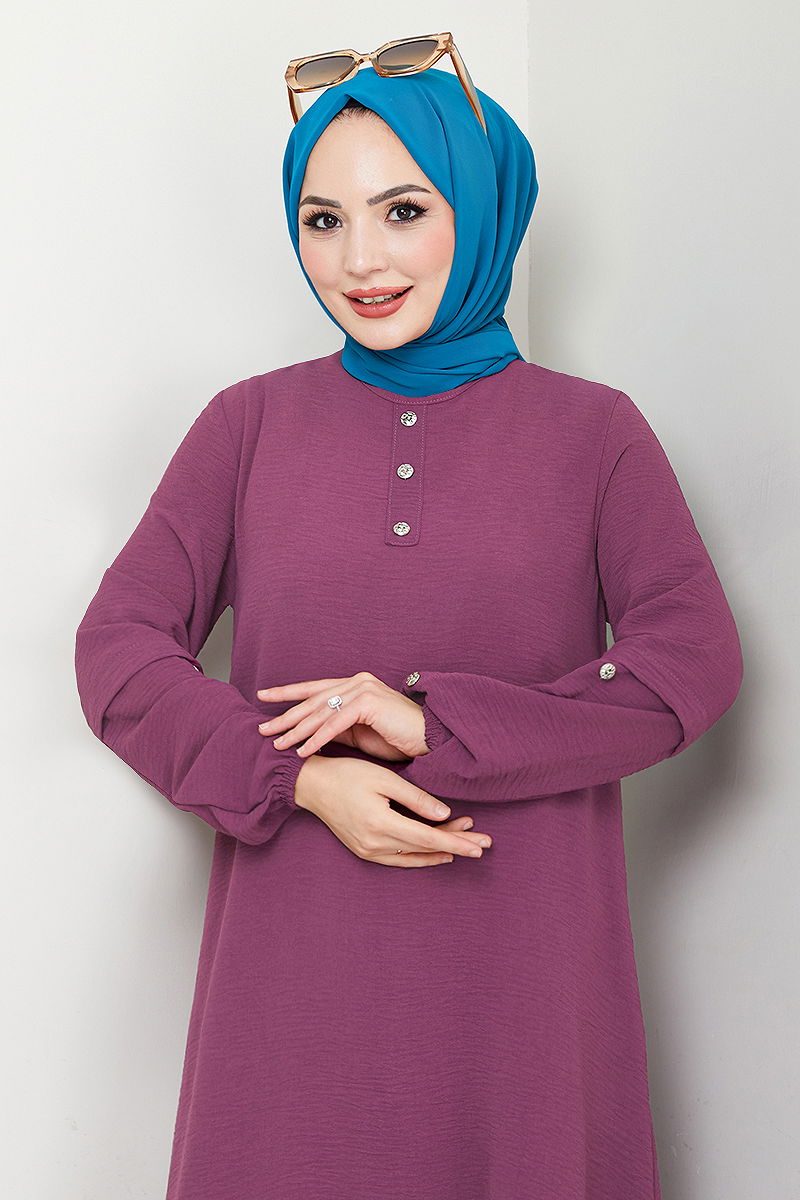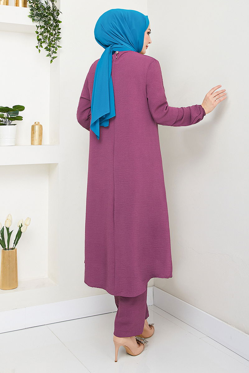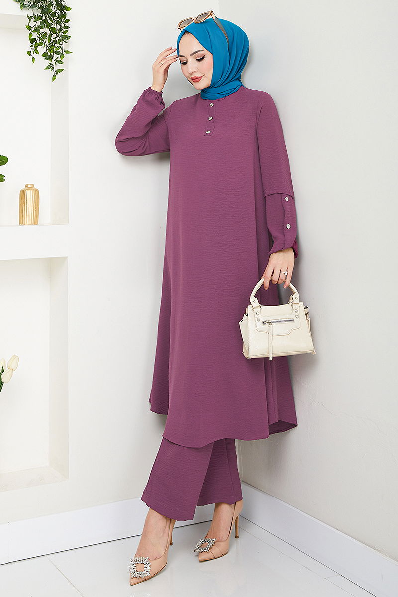 Aksesuar Düğmeli Takım , tesettür giyimin zarif ve şık bir örneği. Aerobin kumaşı sayesinde dört mevsim rahatlıkla kullanılabilir. Hassas yıkama ile 30 derecede yıkanabilir. Tunik ve pantolon tasarımında elastik manşetler ve lastikli bel rahat bir kullanım sunar. Düğmeler şık bir aksesuar olarak dikkat çeker. Bu ürün, hem günlük hem de özel günlerinizde idealdir.