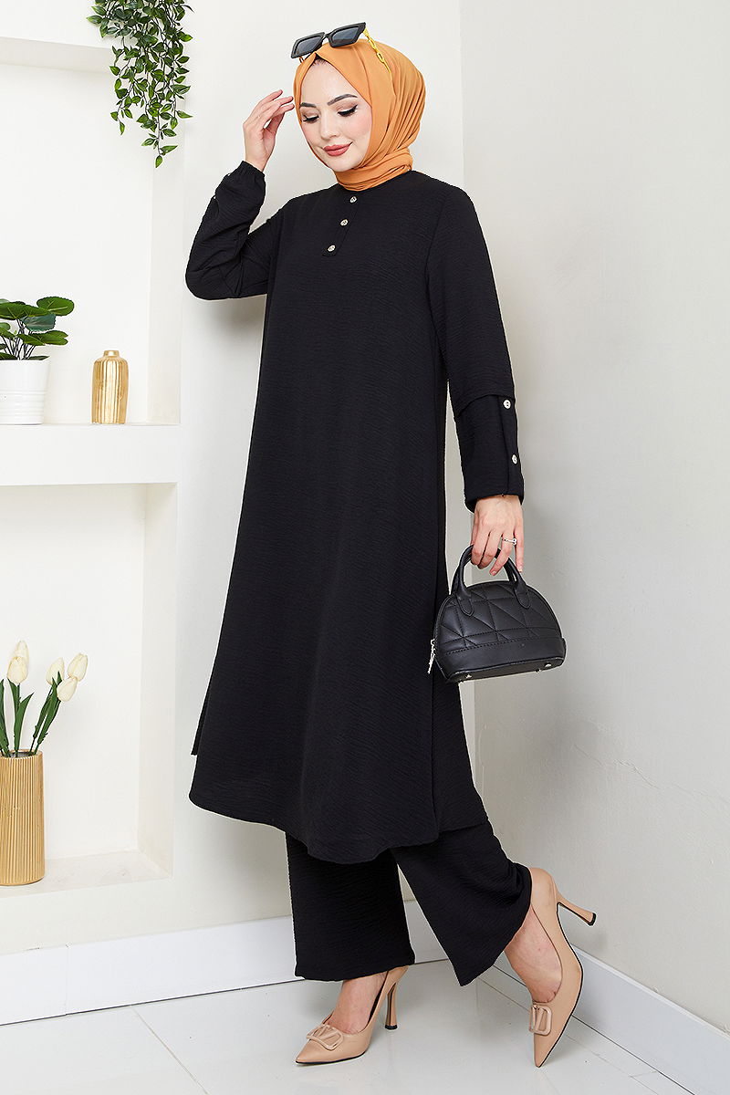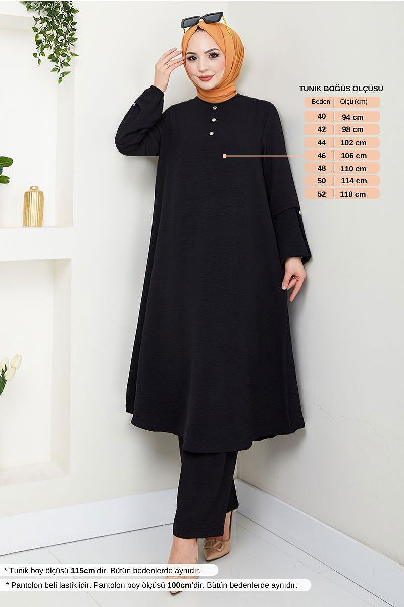 Aksesuar Düğmeli Takım , tesettür giyimin zarif ve şık bir örneği. Aerobin kumaşı sayesinde dört mevsim rahatlıkla kullanılabilir. Hassas yıkama ile 30 derecede yıkanabilir. Tunik ve pantolon tasarımında elastik manşetler ve lastikli bel rahat bir kullanım sunar. Düğmeler şık bir aksesuar olarak dikkat çeker. Bu ürün, hem günlük hem de özel günlerinizde idealdir.