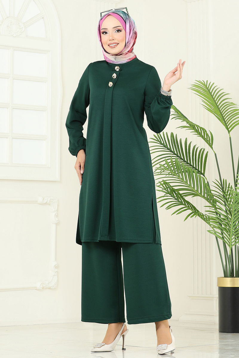 Aksesuar Düğmeli Tesettür Takım Zümrüt