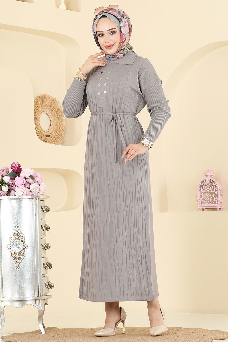 Aksesuar Düğmeli Triko Elbise 211440TPK1167 Açık Gri
